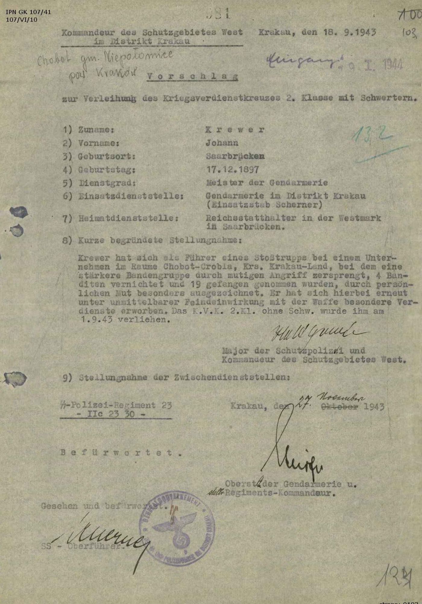 Wniosek odznaczeniowy żandarma Johanna Krewera m.in. za czynne uczestnictwo w pacyfikacji Ispiny. Fot. ze zbiorów IPN
