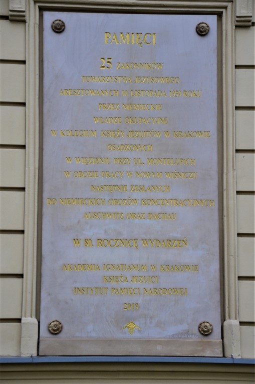 Po mszy świętej odbyła się krótka uroczystość, podczas której dr Maciej Korkuć oraz Maria Konieczna w imieniu dyrektora krakowskiego IPN złożyli kwiat pod tablicą upamiętniającą aresztowanie przez władze okupacyjne 25 jezuitów z kolegium krakowskiego przy ul. Kopernika 26. Niemiecka akcja z 10 listopada 1939 r. była częścią działań skierowanych przeciwko polskiej inteligencji.