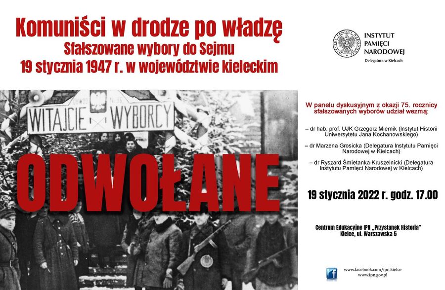 Z przyczyn niezależnych od organizatora panel dyskusyjny „Komuniści w drodze po władzę. Sfałszowane wybory do Sejmu 19 stycznia 1947 r. w województwie kieleckim”, który miał się odbyć 19 stycznia 2022 r. został odwołany. Odbędzie się w innym terminie. Za utrudnienia przepraszamy.