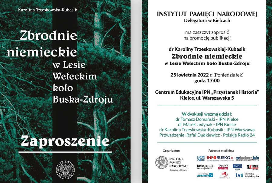 W Centrum Edukacyjnym „Przystanek Historia” IPN w Kielcach (ul. Warszawskiej 5) odbędzie się 25 kwietnia 2022 r. (godz. 17) promocja książki dr. Karoliny Trzeskowskiej-Kubasik „Zbrodnie niemieckie w Lesie Wełeckim koło Buska-Zdroju”. Spotkanie poprowadzi Rafał Dudkiewicz z Polskiego Radia 24. W dyskusji wezmą udział dr Tomasz Domański, dr Marek Jedynak i dr Trzeskowska-Kubasik.