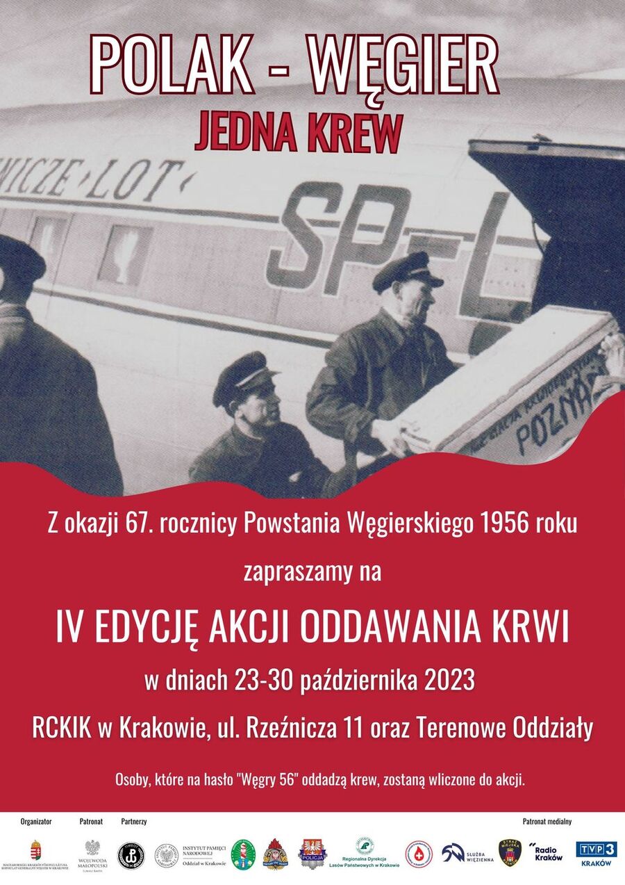 Szczególną rolę w spontanicznej akcji pomocy dla Węgier – nie tylko w postaci oddawanej krwi – spełnił Kraków. O wyrazach solidarności i darach płynących w 1956 r. spod Wawelu do Budapesztu będziemy przypominać przez osiem dni akcji „Polak, Węgier – jedna krew”, od 23 do 30 października 2023 r., na Facebooku krakowskiego oddziału IPN.