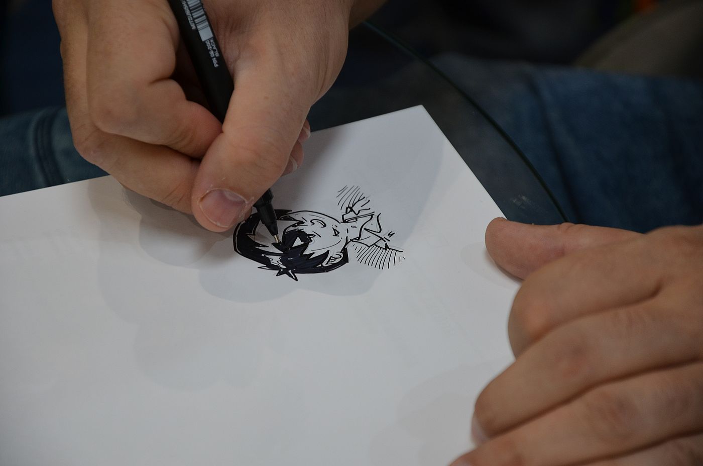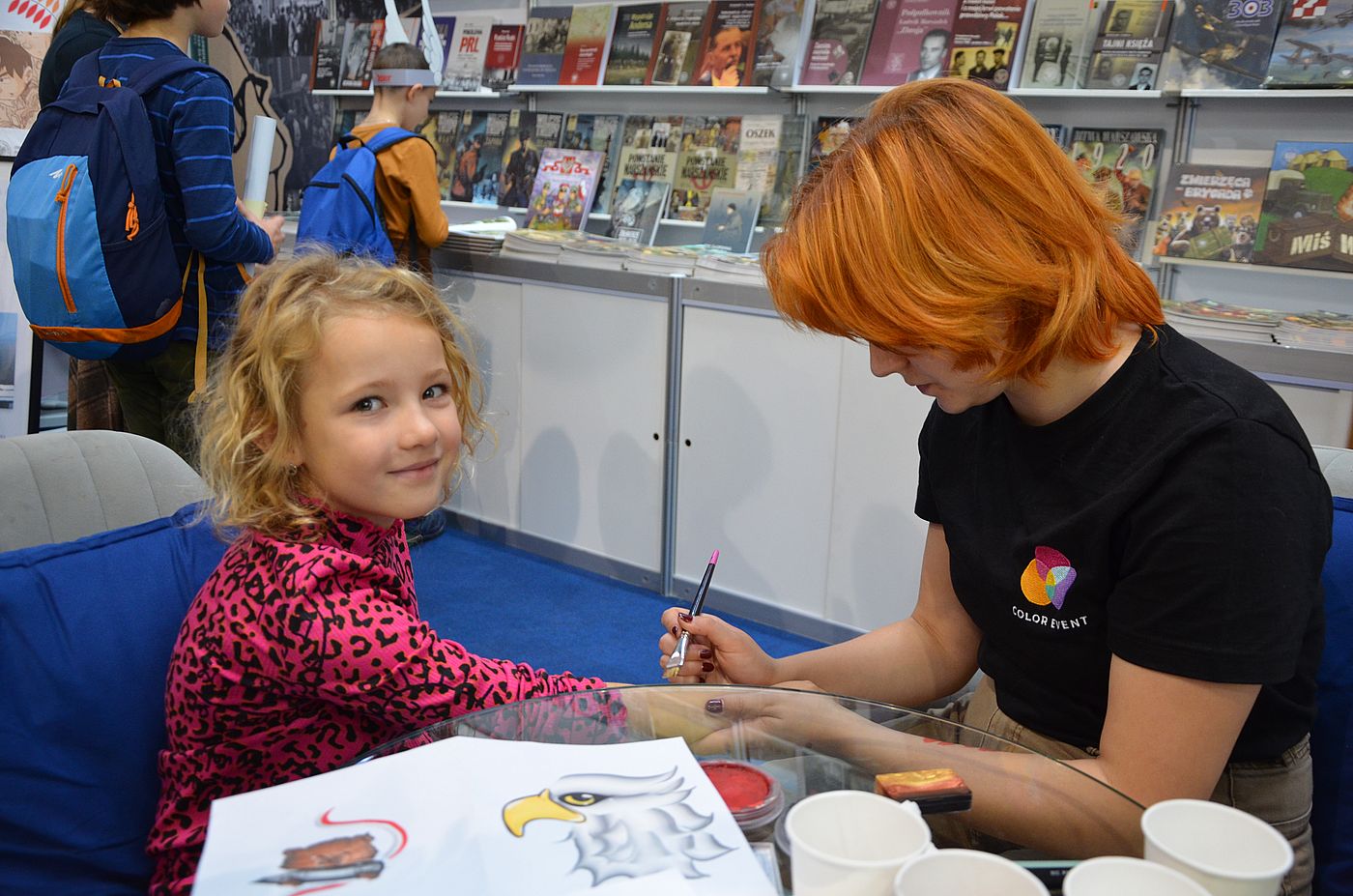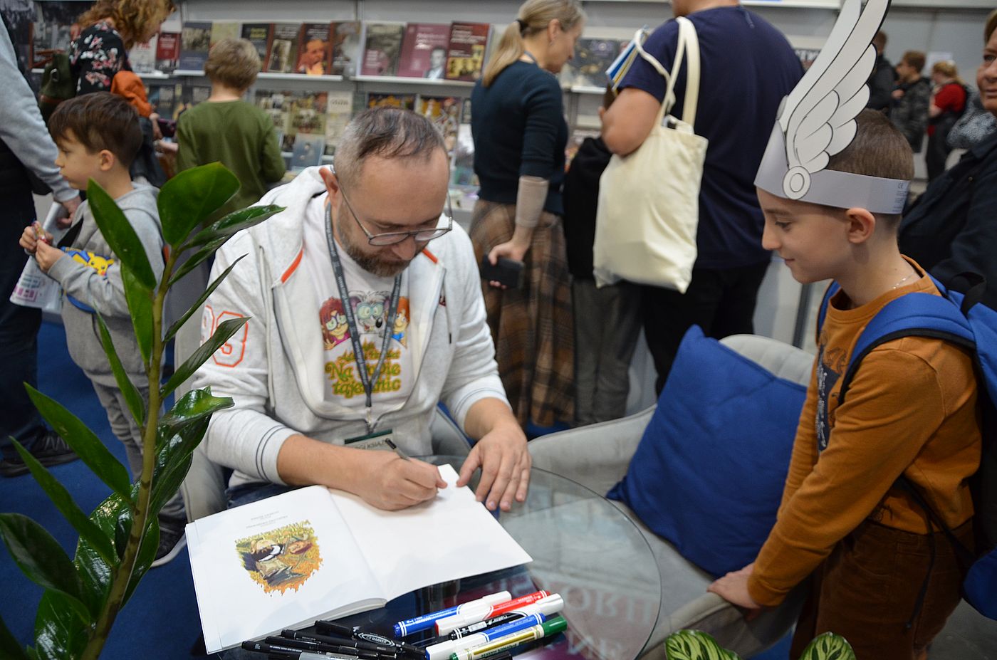 W sobotę 28 października 2023 r. mieliśmy dodatkowe atrakcje. Rano można było poddać się profesjonalnemu malowaniu ciała, a w południe przy naszym stoliku zasiadł Hubert Ronek, autor rysunków do serii komiksów „Wojenna odyseja Antka Srebrnego”. Przez trzy godziny bez przerwy rysował dedykacje, ale to dla niego betka, bo rękę do rysowania ma przecież przyzwyczajoną.