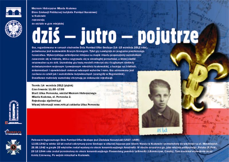 Muzeum Historyczne Miasta Krakowa oraz Biuro Edukacji Publicznej Instytutu Pamięci Narodowej w Krakowie zapraszają do udziału w grze miejskiej „Dziś – jutro – pojutrze”.