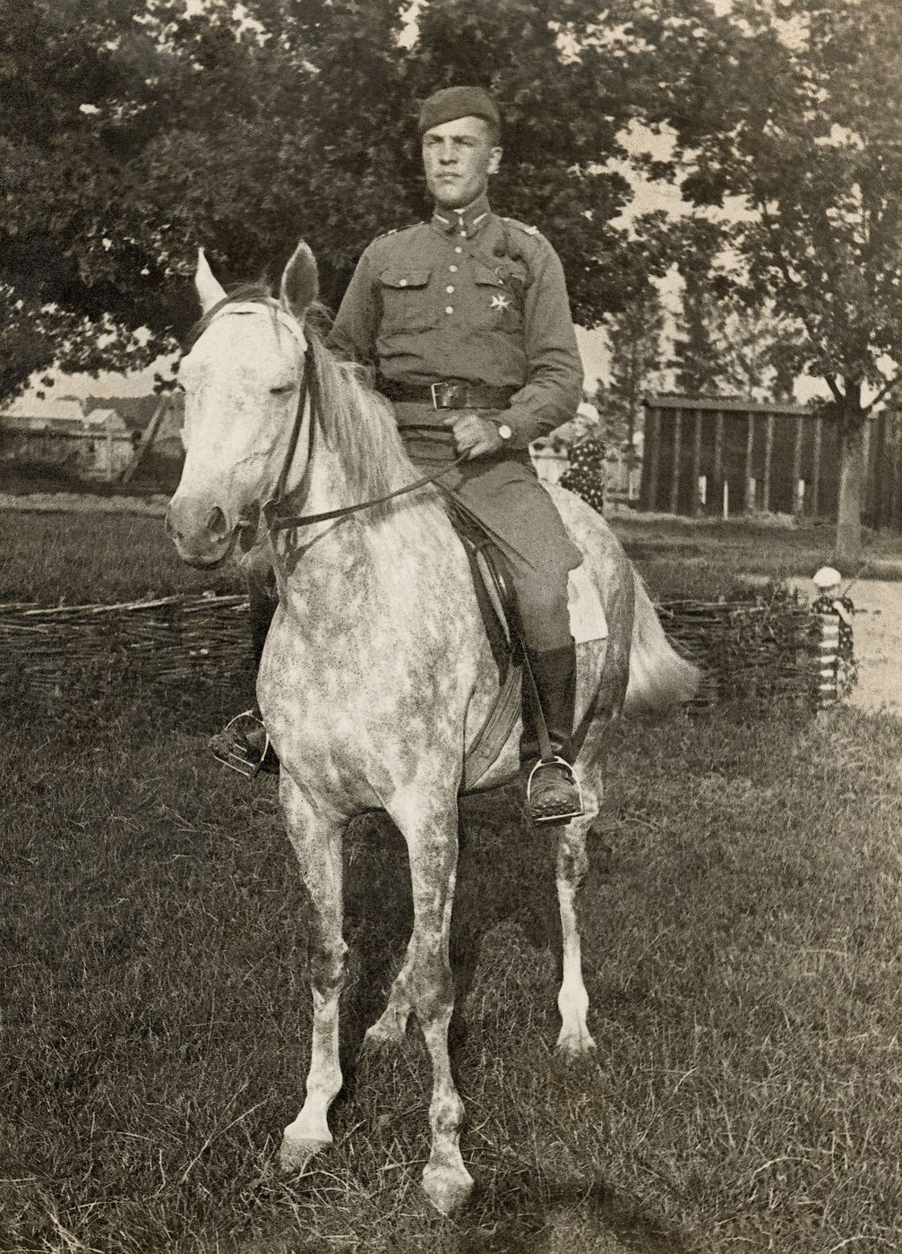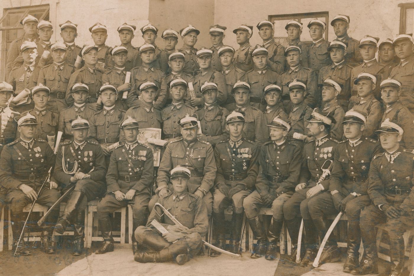 Zakończenie nauki w szkole podoficerskiej w 5. pułku strzelców konnych. W pierwszym rzędzie kadra oficerska pułku, powyżej strzelcy konni ze świadectwami ukończenia szkoły podoficerskiej oraz „Zarysami historji wojennej 5 pułku strzelców konnych” w rękach. Ludwik Kawik stoi trzeci z prawej w drugim rzędzie od dołu. Fot. archiwum rodzinne -