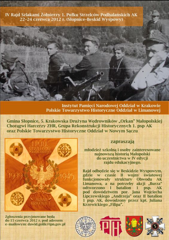 W dniach 22–24 czerwca 2012 r. odbyła się IV edycja rajdu edukacyjnego z cyklu „Szlakami Żołnierzy 1. Pułku Strzelców Podhalańskich AK”, zorganizowanego wspólnie przez Instytut Pamięci Narodowej Oddział w Krakowie oraz Oddział Polskiego Towarzystwa Historycznego w Limanowej. Inicjatywę wsparły również: Gmina Słopnice, Małopolska Chorągiew Harcerzy ZHR (5. KDW „Orkan”), Grupa Rekonstrukcji Historycznych 1. PSP AK, Oddział PTH w Nowym Sączu oraz Starostwo Powiatowe w Limanowej.