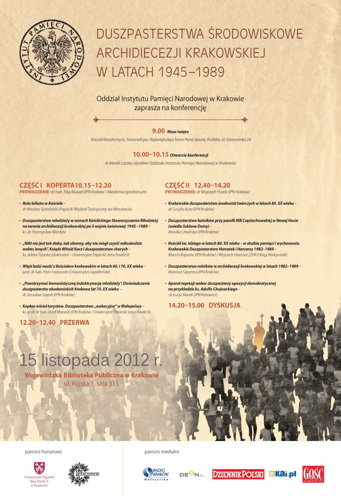 Konferencja naukowa „Duszpasterstwa środowiskowe archidiecezji krakowskiej w latach 1945–1989” – Kraków, 15 listopada 2012