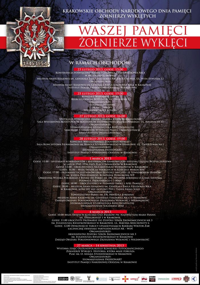 Krakowskie Obchody Narodowego Dnia Pamięci „Żołnierzy Wyklętych” swoim honorowym patronatem zgodzili się objąć: Wojewoda Małopolski Jerzy Miller, Marszałek Województwa Małopolskiego Marek Sowa, Przewodniczący Sejmiku Małopolskiego Kazimierz Barczyk, Prezydenta Miasta Krakowa Jacek Majchrowski, Przewodniczący Rady Miasta Krakowa Bogusław Kośmider, Wójt Gminy Tarnów Grzegorz Kozioł, Jego Eminencja Metropolita Krakowski Stanisław Kardynał Dziwisz, Rektorzy: Uniwersytetu Jagiellońskiego prof. dr hab. med. Wojciech Nowak, Uniwersytetu Papieskiego Jana Pawła II w Krakowie ks. dr hab. Władysław Zuziak, prof. UPJP II, Uniwersytetu Rolniczego im. Hugona Kołłątaja prof. dr hab. Włodzimierz Sady, Zarząd Fundacji AK w Londynie, Przewodniczący Zarządu Regionu Małopolska NSZZ „Solidarność” Wojciech Grzeszek, Prezes Zarządu Okręgu Małopolska Światowego Związku Żołnierzy AK Ryszard Brodowski, Przewodniczący Małopolskiej Rady Kombatantów i Osób Represjonowanych Dionizy Smyk, Prezes Oddziału Krakowskiego Światowego Związku Żołnierzy AK Jerzy Krusenstern, Prezes Zarządu Obszaru Południowego Zrzeszenia „Wolność i Niezawisłość” Małgorzata Janiec, Przewodniczący Porozumienia Organizacji Kombatanckich i Niepodległościowych w Krakowie Krzysztof Bzdyl, Dyrektor Muzeum Armii Krajowej im. Generała Emila Fieldorfa „Nila” w Krakowie Adam Rąpalski.