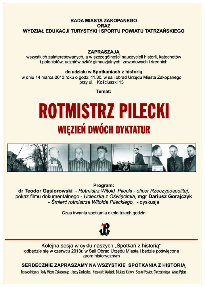 Rada Miasta Zakopanego oraz Wydział Edukacji Turystyki i Sportu Powiatu Tatrzańskiego zapraszają wszystkich zainteresowanych, a w szczególności nauczycieli historii, katechetów i polonistów, uczniów szkół gimnazjalnych, zawodowych i średnich do udziału w Spotkaniach z historią, w dniu 14 marca 2013 roku, o godzinie 11.30, w sali obrad Urzędu Miasta Zakopanego, przy ul. Kościuszki 13. Tematem spotkania będzie „Rotmistrz Pilecki. Więzień dwóch dyktatur”.
