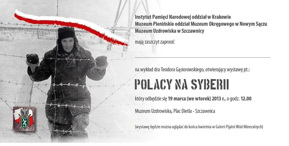 Instytut Pamięci Narodowej Oddział w Krakowie, Muzeum Pienińskie oraz Muzeum Uzdrowiska w Szczawnicy zapraszają we wtorek 19 marca 2013 r. o godz. 12.00 do Muzeum Uzdrowiska w Szczawnicy, przy pl. Dietla, na otwarcie wystawy „Polacy na Syberii". Wykład okolicznościowy na temat losów Polaków na Syberii wygłosi dr Teodor Gąsiorowski z Oddziałowego Biura Edukacji Publicznej IPN w Krakowie. Wystawę będzie można oglądać do końca kwietnia 2013 r.