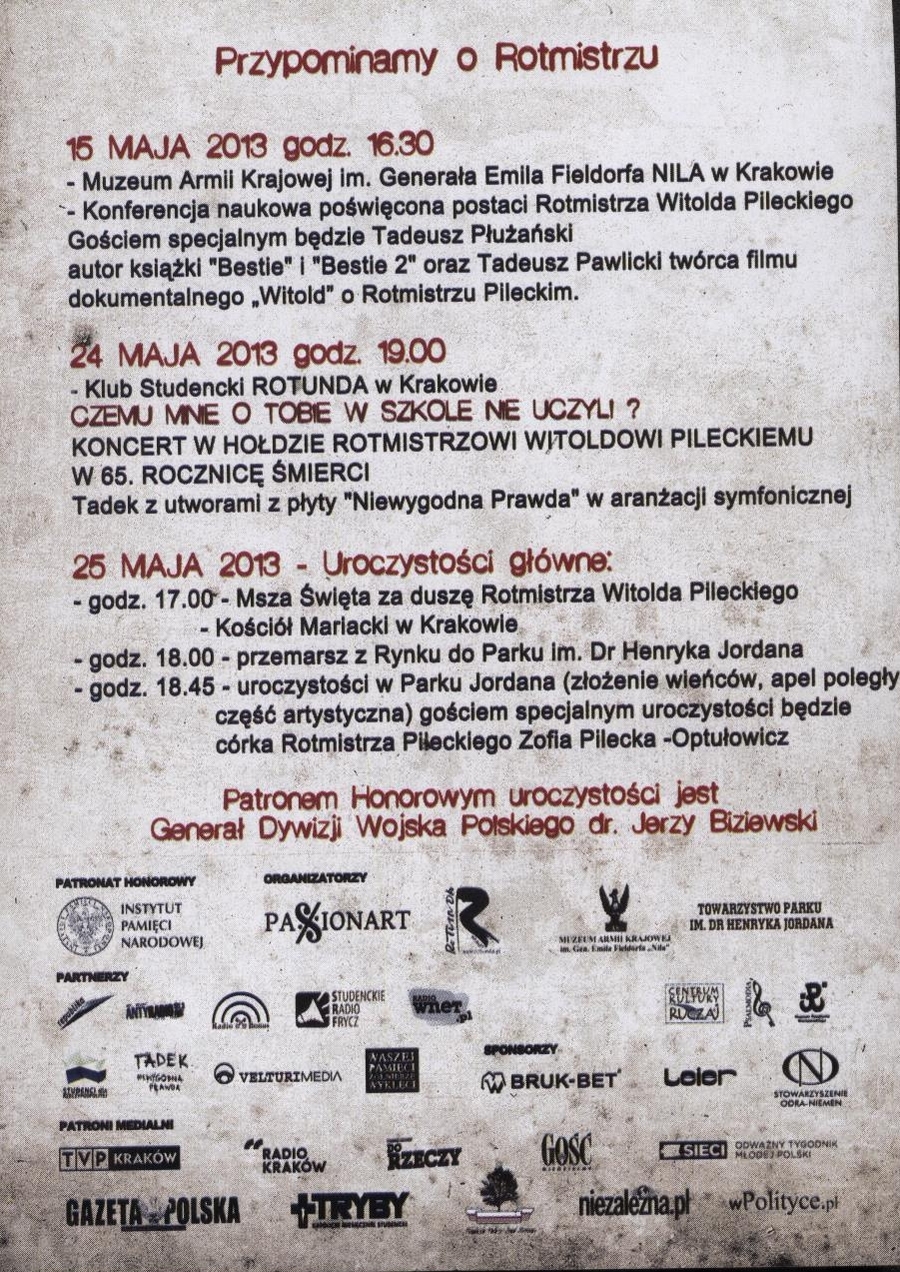 Podczas głównych uroczystości upamiętniających 65. rocznicę śmierci Rotmistrza Witolda Pileckiego w Krakowie wygłosi prelekcję dr Marek Lasota, dyrektor Oddziału Instytutu Pamięci Narodowej w Krakowie. Gościem specjalnym uroczystości będzie córka Rotmistrza – Zofia Pilecka-Optułowicz.