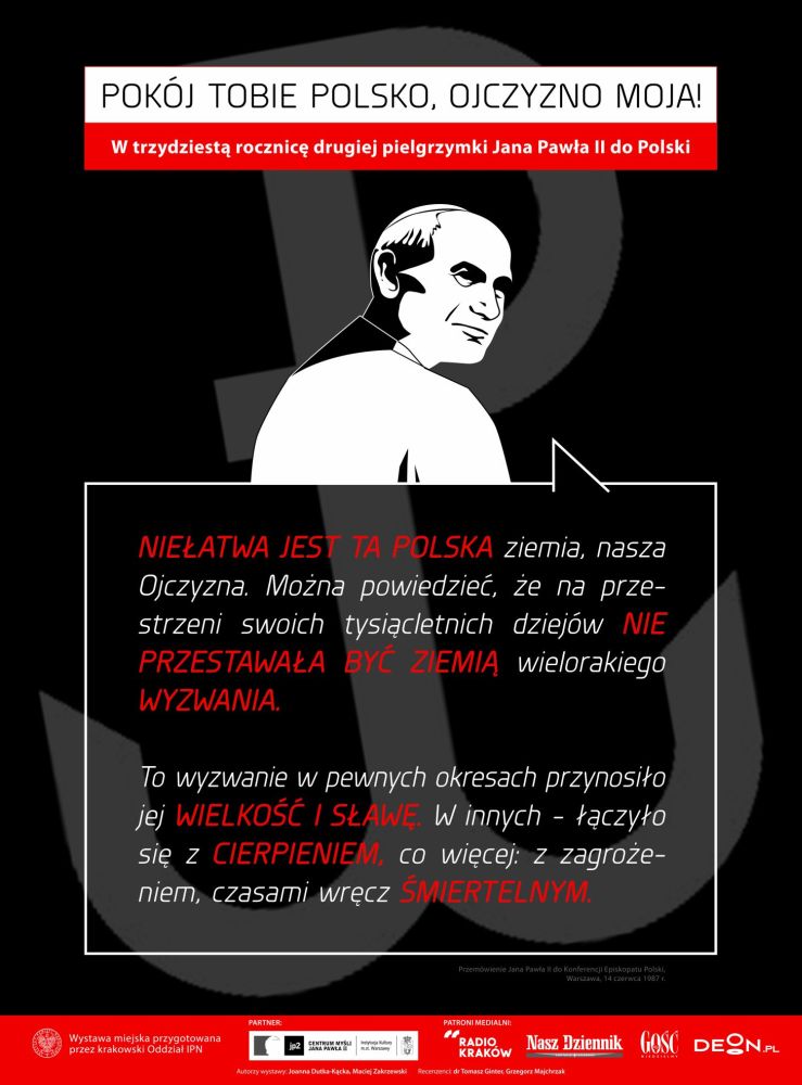 Oddział Instytutu Pamięci Narodowej w Krakowie zaprasza na wystawę miejską zatytułowaną „Pokój Tobie Polsko, Ojczyzno moja! W 30. rocznicę drugiej pielgrzymki Jana Pawła II do Polski”.