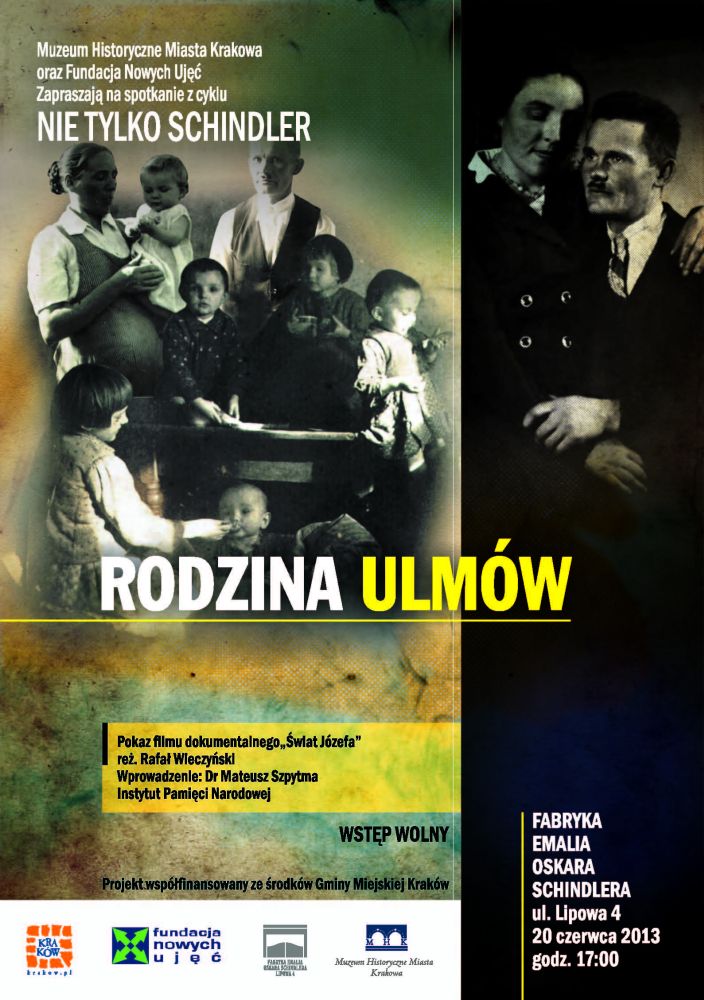 Dr Mateusz Szpytma wygłosi wprowadzenie historyczne przed pokazem filmu „Świat Józefa” (reż. Rafał Wieczyński) nt. historii rodziny Ulmów, zamordowanej przez Niemców za pomoc Żydom z rodzin Szallów i Goldmanów. Wydarzenie to jest organizowane w ramach cyklu spotkań historyczno-filmowych „Nie tylko Schindler” przez Muzeum Historyczne Miasta Krakowa Oddział Fabryka Emalia Oskara Schindlera oraz Fundację Nowych Ujęć.