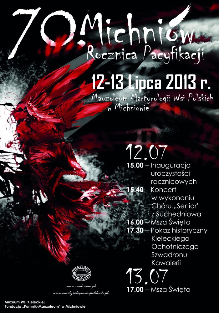 12 i 13 lipca 2013 r. w Mauzoleum Martyrologii Wsi Polskich w Michniowie odbędą się uroczystości 70. rocznicy pacyfikacji tej miejscowości, dokonanej 12 i 13 lipca 1943 r. przez oddziały policji niemieckiej. Podczas pacyfikacji zostały zamordowane 204 osoby: kobiety, dzieci i mężczyźni.