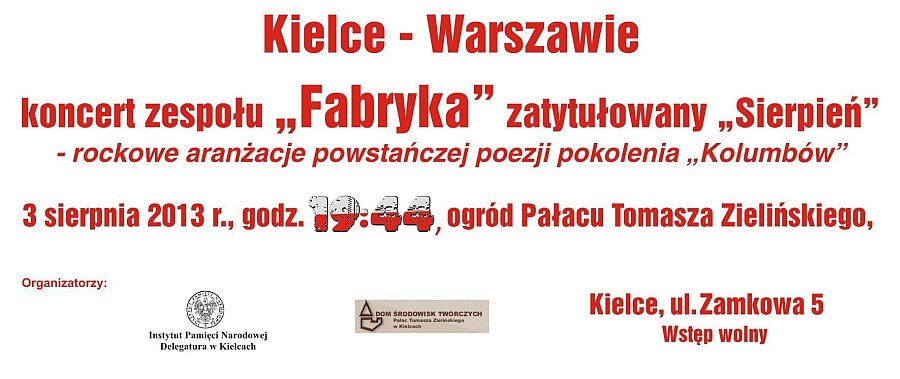Organizatorzy: Instytut Pamięci Narodowej Delegatura w Kielcach i Dom Środowisk Twórczych Pałac Tomasza Zielińskiego w Kielcach zapraszają na koncert zespołu „Fabryka” zatytułowany „Sierpień” – rockowe aranżacje powstańczej poezji pokolenia „Kolumbów”.