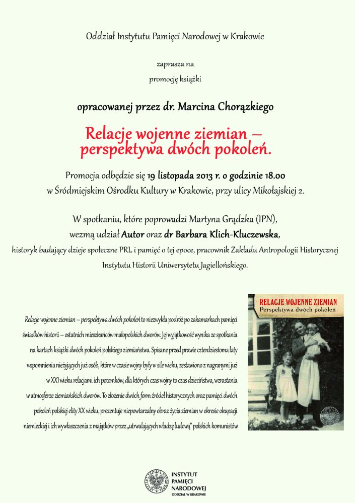 Oddział Instytutu Pamięci Narodowej w Krakowie zaprasza na spotkanie promocyjne, którego tematem będzie opracowana przez dr. Marcina Chorązkiegoksiązka Relacje wojenne ziemian – perspektywa dwóch pokoleń.