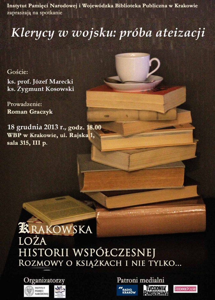 Instytut Pamięci Narodowej oraz Wojewódzka Biblioteka Publiczna w Krakowie zapraszają na drugą dyskusję „Klerycy w wojsku: próba ateizacji". W rozmowie wezmą udział ks. prof. Józef Marecki i ks. Zygmunt Kosowski. Spotkanie poprowadzi Roman Graczyk.