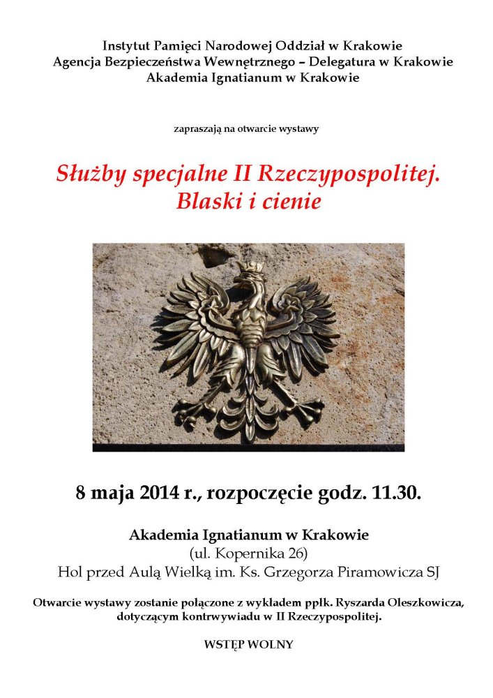 Instytut Pamięci Narodowej Oddział w Krakowie, Agencja Bezpieczeństwa Wewnętrznego – Delegatura w Krakowie, Akademia Ignatianum w Krakowie zapraszają na wystawę Służby specjalne II Rzeczypospolitej. Blaski i cienie.