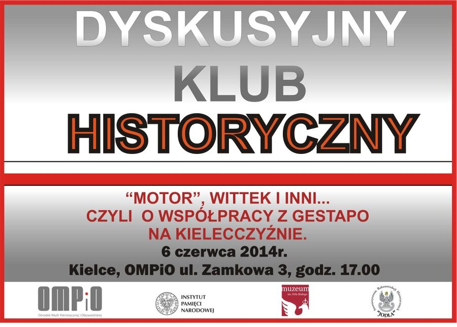 6 czerwca 2014 r., o godzinie 17.00, w siedzibie Ośrodka Myśli Patriotycznej i Obywatelskiej w Kielcach przy ul. Zamkowej 3 odbędzie się spotkanie Dyskusyjnego Klubu Historycznego. Tym razem zaproszeni goście dyskutować będą na temat: Wittek, „Motor" i inni…, czyli o współpracy z Gestapo na Kielecczyźnie. Dyskusję poprowadzi dr Tomasz Domański – historyk z Delegatury IPN w Kielcach.