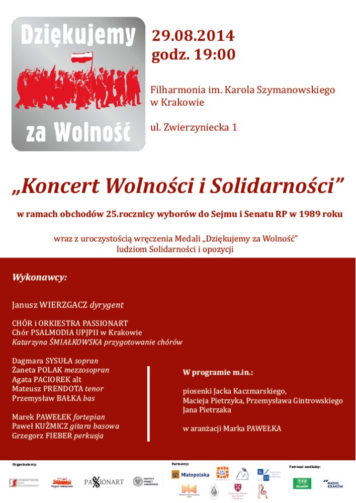 Na koncert zapraszają organizatorzy: Stowarzyszenie SIEĆ SOLIDARNOŚCI, Zarząd Regionu Małopolska NSZZ „Solidarność", Oddział Instytutu  Pamięci Narodowej w Krakowie oraz Stowarzyszenie PASSIONART.