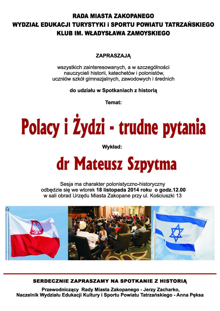 Dr Mateusz Szpytma wygłosił 18 listopada 2014 r. wykład adresowany m.in. dla nauczycieli i uczniów, zatytułowany „Polacy i Żydzi – trudne pytania". Wykład w ramach „Spotkań z historią", organizowanych przez Radę Miasta Zakopanego, Wydział Edukacji Turystyki i Sportu Powiatu Tatrzańskiego i Klub im. Władysława Zamoyskiego, odbył się w sali obrad Urzędu Miasta Zakopanego (ul. Kościuszki 13).