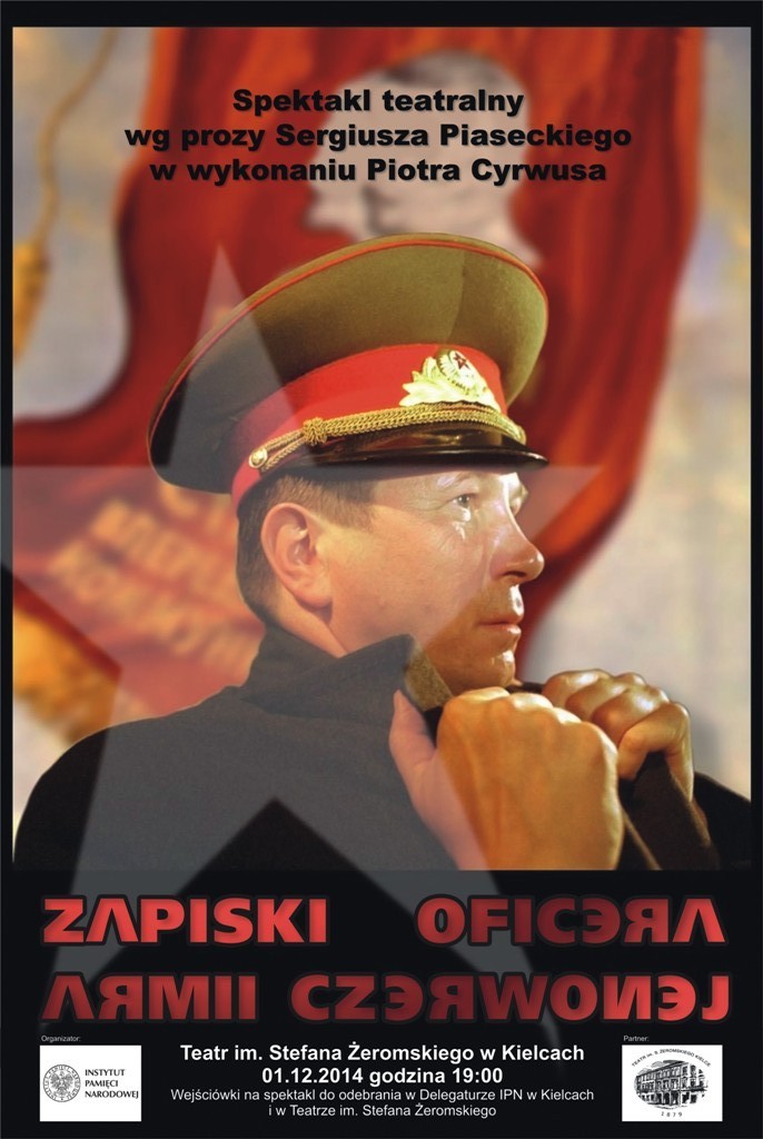 1 grudnia 2014 r., o godz. 19.00, w Teatrze im. Stefana Żeromskiego przy ul. Henryka Sienkiewicza 32 odbędzie się spektakl „Zapiski oficera Armii Czerwonej" według prozy Sergiusza Piaseckiego w wykonaniu Piotra Cyrwusa i w reżyserii Tomasza Obary.