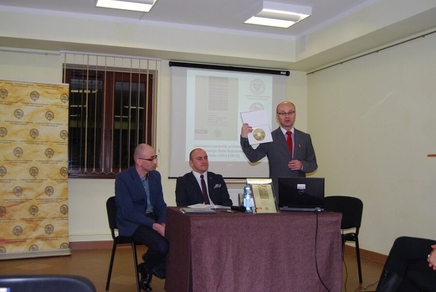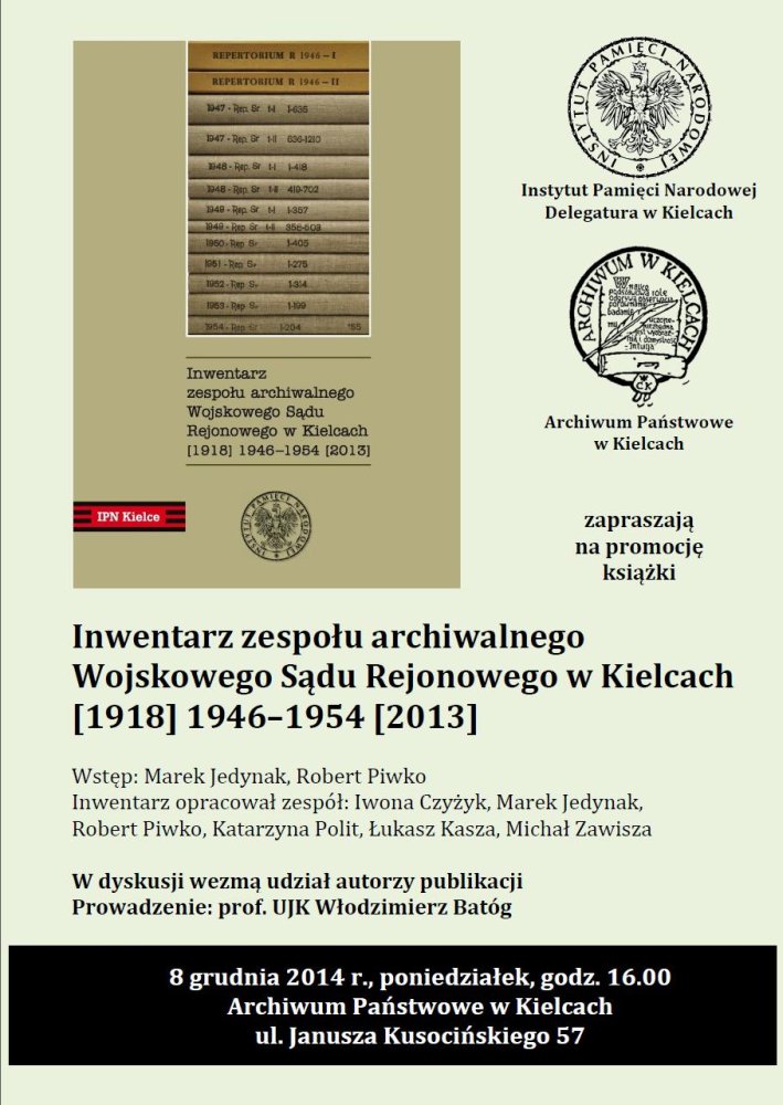 Delegatura Instytutu Pamięci Narodowej w Kielcach i Archiwum Państwowe w Kielcach zapraszają na promocję książki Inwentarz zespołu archiwalnego Wojskowego Sądu Rejonowego w Kielcach [1918] 1946–1954 [2013], wstęp: Marek Jedynak, Robert Piwko, inwentarz opracował zespół: Iwona Czyżyk, Marek Jedynak, Robert Piwko, Katarzyna Polit, Łukasz Kasza, Michał Zawisza, Kielce-Kraków 2014.