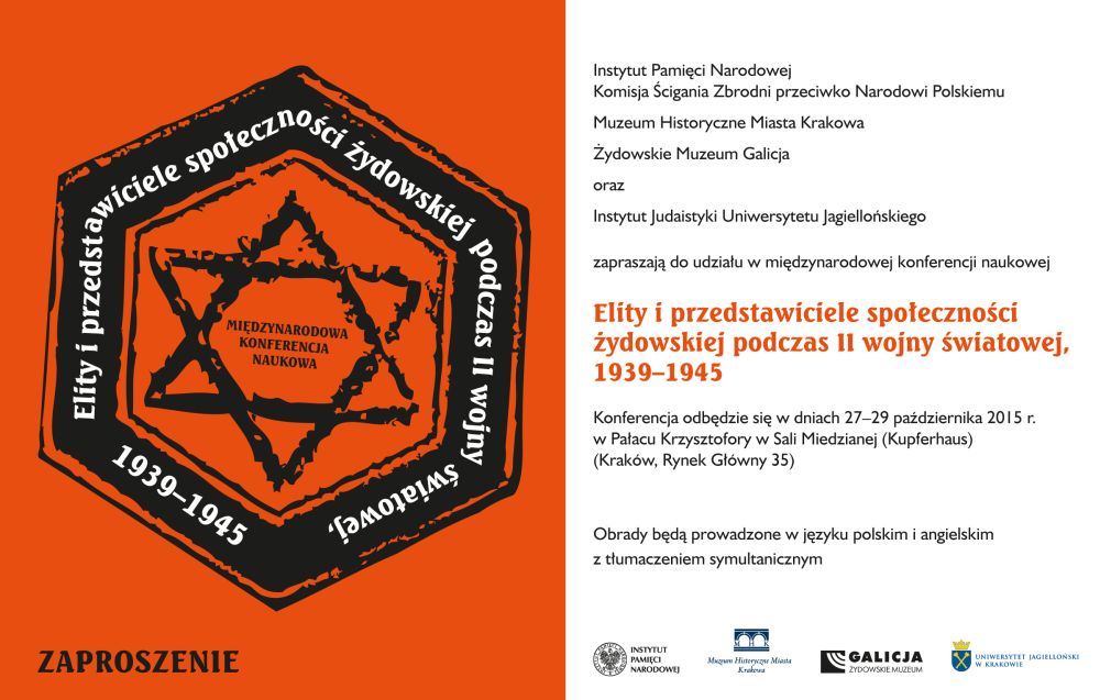Międzynarodowa konferencja „Elity i przedstawiciele społeczności żydowskiej podczas II wojny światowej (1939–1945)” organizowana jest przez Instytut Pamięci Narodowej, we współpracy z Instytutem Judaistyki Uniwersytetu Jagiellońskiego oraz Żydowskim Muzeum Galicja w Krakowie. Głównym celem konferencji jest debata nad funkcjonowaniem elit oraz przedstawicieli społeczności żydowskiej w latach II wojny światowej. Ma ona stanowić próbę znalezienia odpowiedzi na pytania dotyczące procesu ciągłości elit wojennych z przedwojennymi wzorcami oraz ukazania zmian wynikających z rzeczywistości wojny i okupacji. Istotnym elementem konferencji jest próba zdefiniowania terminu „elity żydowskie”, a także ukazanie stanu badań dotychczas prowadzonych w tym temacie. Głównym założeniem konferencji jest wszechstronne ujęcie historii i roli elit oraz przedstawicieli społeczności żydowskiej we wskazanym okresie poprzez prezentację ich dokonań, postaw, zachowań, mentalności oraz mechanizmów postępowania. Temat ten chcemy przedstawić zarówno w ujęciu globalnym, jak też omawiając regionalne przykłady.