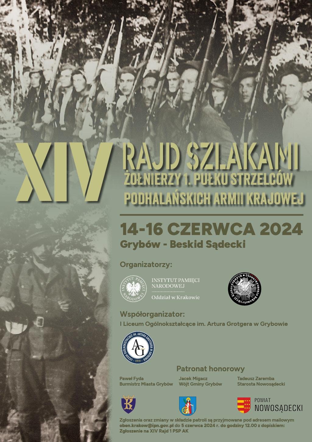 Zgłoszenia oraz zmiany w składzie patroli przyjmowane są pod adresem e-mail: oben.krakow@ipn.gov.pl do 5 czerwca 2024 r. (do 12.00), z dopiskiem: „Zgłoszenie na XIV Rajd 1PSP AK”. Konieczne jest potwierdzenie telefoniczne zgłoszenia – tel. 881 015 159.