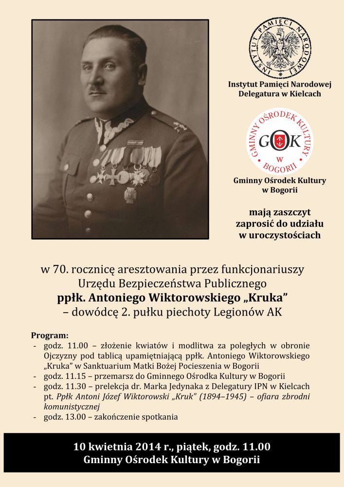Delegatura Instytutu Pamięci Narodowej w Kielcach oraz Gminny Ośrodek Kultury w Bogorii mają zaszczyt zaprosić do udziału w uroczystościach w 70. rocznicę aresztowania przez funkcjonariuszy Urzędu Bezpieczeństwa Publicznego ppłk. Antoniego Wiktorowskiego „Kruka” – dowódcy 2. pułku piechoty Legionów AK.