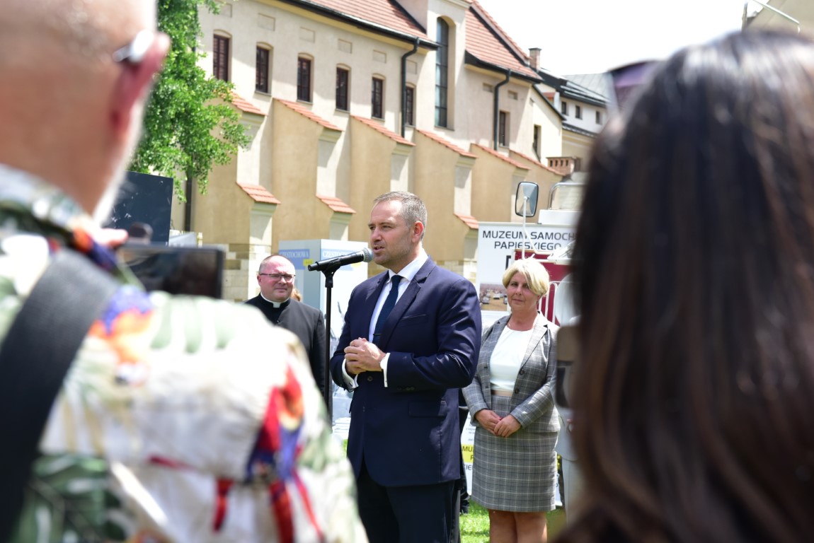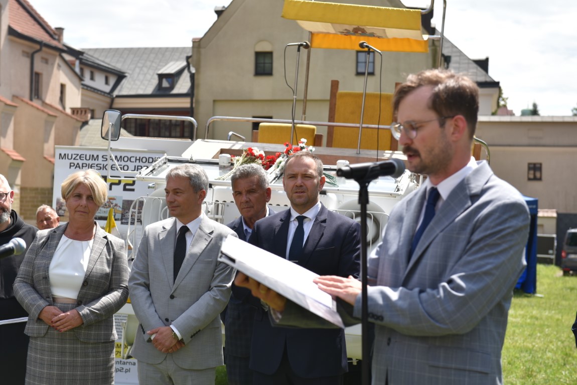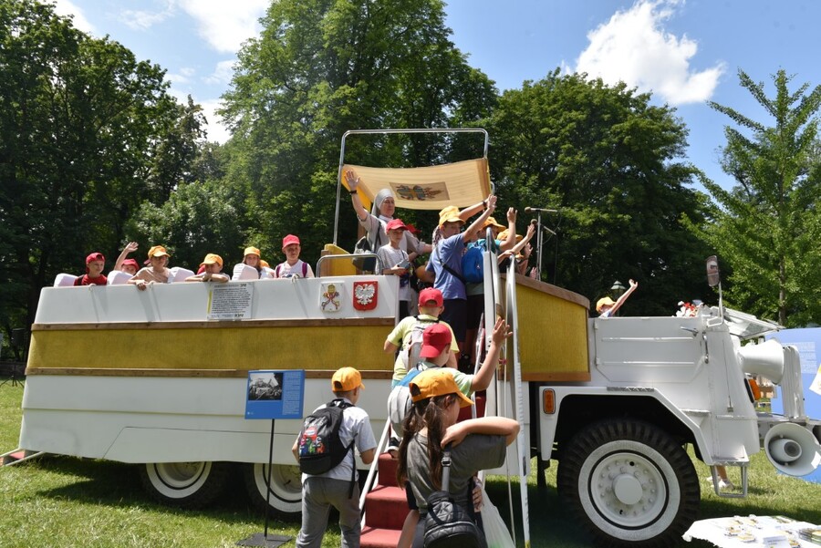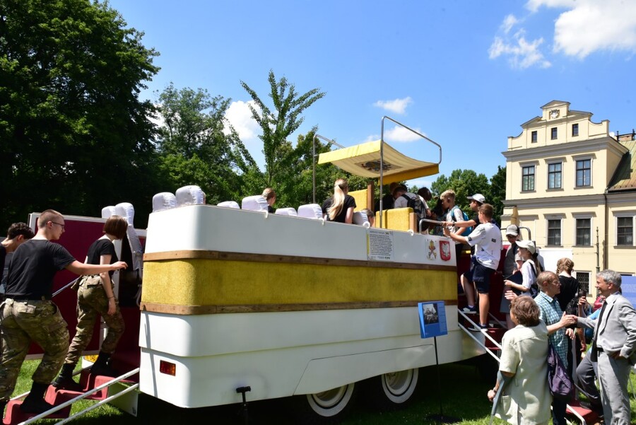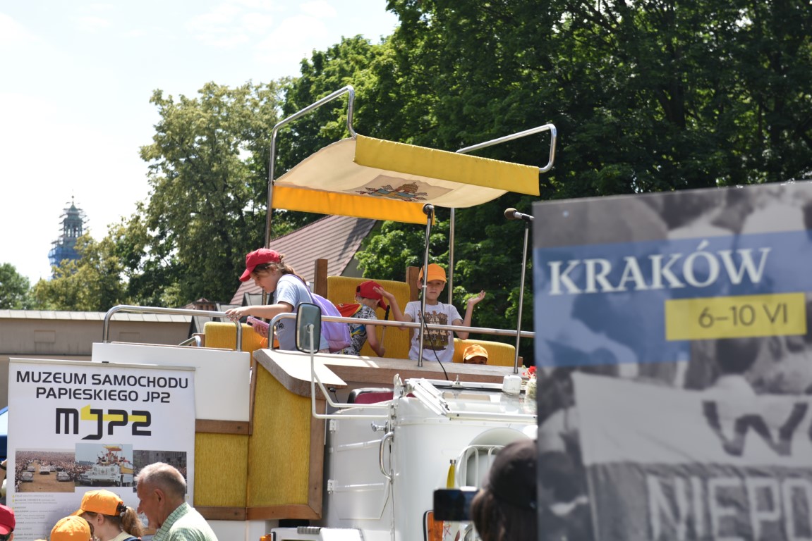 Przybyli goście mieli niezwykłą okazję zobaczyć z bliska wierną rekonstrukcję papamobile, zbudowaną z oryginalnych części, która jest prezentowana na stałe w Muzeum Samochodu Papieskiego JP2 w Kielcach.