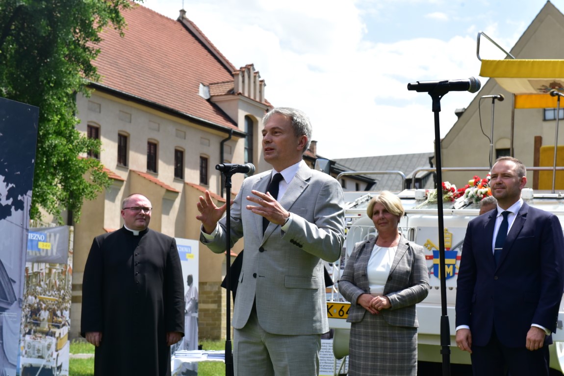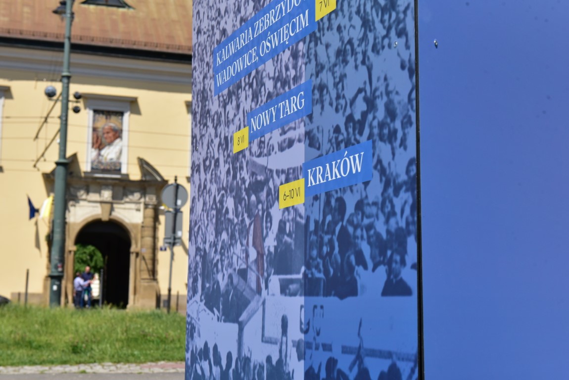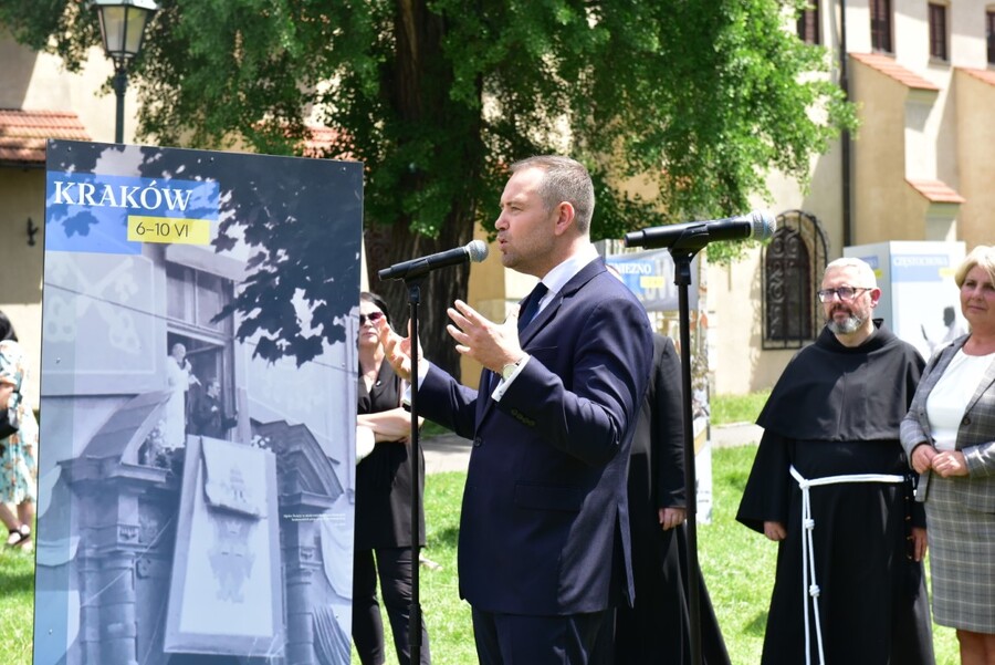– Jakże potężny musiał być człowiek, żeby w czerwcu 1979 r. aparat totalitarnego państwa komunistycznego wysłał wojskowy wywiad, kontrwywiad, służbę bezpieczeństwa. Jak potężny musiał być człowiek, przeciwko któremu tylko w Archidiecezji Krakowskiej wysłano 1037 funkcjonariuszy Służby Bezpieczeństwa i 67 tysięcy milicjantów oraz setki agentów. – rozpoczął przemówienie dr Karol Nawrocki, prezes Instytutu Pamięci Narodowej, otwierając wystawę 6 czerwca 2024 na Placu Franciszkańskim, naprzeciw Kurii Metropolitalnej – Jan Paweł II odpowiadał z miłością na wszystkie zabiegi Służb Bezpieczeństwa i komunistycznego państwa, mówiąc tu w Krakowie, na Błoniach: „Musicie być mocni mocą wiary. Musicie być mocni mocą nadziei.”. Pielgrzymka Jana Pawła II pozwoliła zaprowadzić Polskę długą drogą do niepodległej ojczyzny.