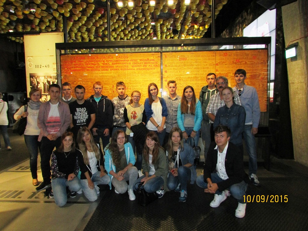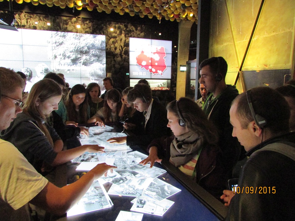 Zasadniczą częścią wyjazdu była wizyta w Europejskim Centrum Solidarności, gdzie przewodnik ECS oprowadził uczestników po robiącej duże wrażenie i znakomicie eksponowanej stałej wystawie. Młodzież zobaczyła oryginalne tablice z postulatami strajkujących robotników oraz wozy bojowe i sprzęt funkcjonariuszy MO. Doskonale przygotowane sale wystawowe, uzupełniane multimediami, wprowadzały zwiedzających w klimat lat osiemdziesiątych. Można było obejrzeć typowe wyposażenie PRL-owskiego mieszkania, puste sklepowe półki, sprzęt do drukowania nielegalnej prasy oraz ulotki i transparenty przygotowywane przez opozycjonistów. Na koniec młodzież zasiadła przy okrągłym stole i obejrzała plakaty wyborcze oraz dokumenty z 1989 roku. Zwiedzający uzyskali także informacje o bogatych zbiorach archiwalnych, bibliotece i mediatece.