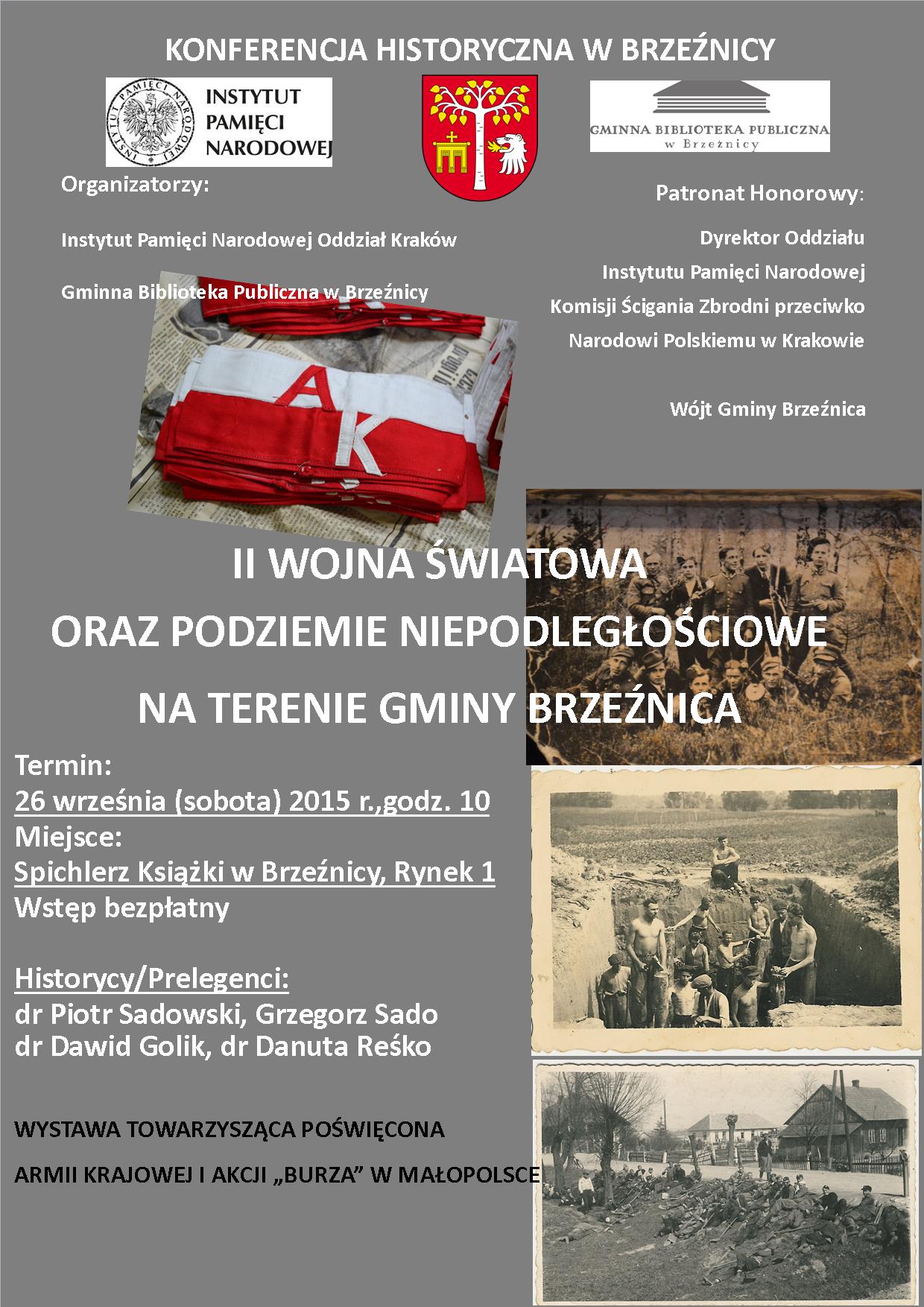 Gminna Biblioteka Publiczna w Brzeźnicy wspólnie z Instytutem Pamięci Narodowej Oddział w Krakowie zaprasza na sesję naukowo-edukacyjną w rocznicę powstania w 1939 r. Polskiego Państwa Podziemnego. Sesja rozpocznie się w Spichlerzu Książki w Brzeźnicy (Rynek 1), o godz. 10.00, w dniu 26 września 2015. Sesji towarzyszyć będzie otwarcie wystawy IPN pt. „Burza. Armia Krajowa 1944 roku” oraz sprzedaż książek historycznych wydanych przez OIPN w Krakowie.
