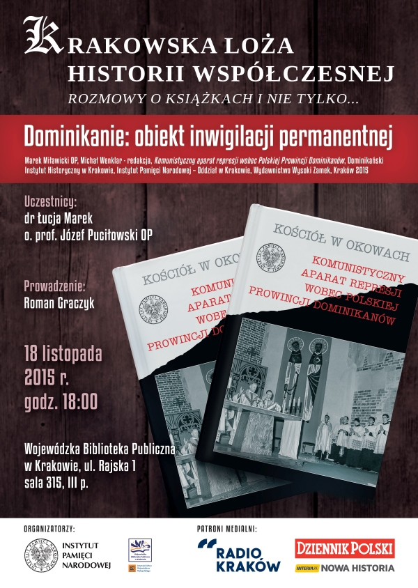 Instytut Pamięci Narodowej oraz Wojewódzka Biblioteka Publiczna w Krakowie zapraszają na spotkanie w Krakowskiej Loży Historii Współczesnej, zatytułowane „Dominikanie: obiekt inwigilacji permanentnej”. W dyskusji udział wezmą dr Łucja Marek oraz o. prof. Józef Puciłowski (OP), a rozmowę poprowadzi jak zawsze Roman Graczyk.