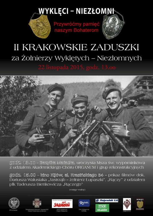 Akcja Wyklęci – Niezłomni. Przywróćmy pamięć naszym Bohaterom, Stowarzyszenie Wolność i Niezawisłość Obszar Południowy w Krakowie oraz Instytut Pamięci Narodowej Oddział Kraków zapraszają na II Krakowskie Zaduszki za Żołnierzy Wyklętych – Niezłomnych w dniu 22 listopada 2015 r.