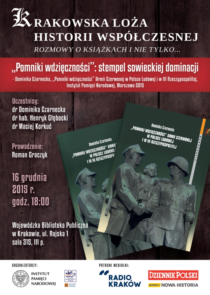 Instytut Pamięci Narodowej oraz Wojewódzka Biblioteka Publiczna w Krakowie zapraszają na spotkanie w Krakowskiej Loży Historii Współczesnej. W dyskusji zatytułowanej „Pomniki wdzięczności: stempel sowieckiej dominacji” udział wezmą dr Dominika Czarnecka, dr hab. Henryk Głębocki, dr Maciej Korkuć, a rozmowę poprowadzi jak zawsze Roman Graczyk.