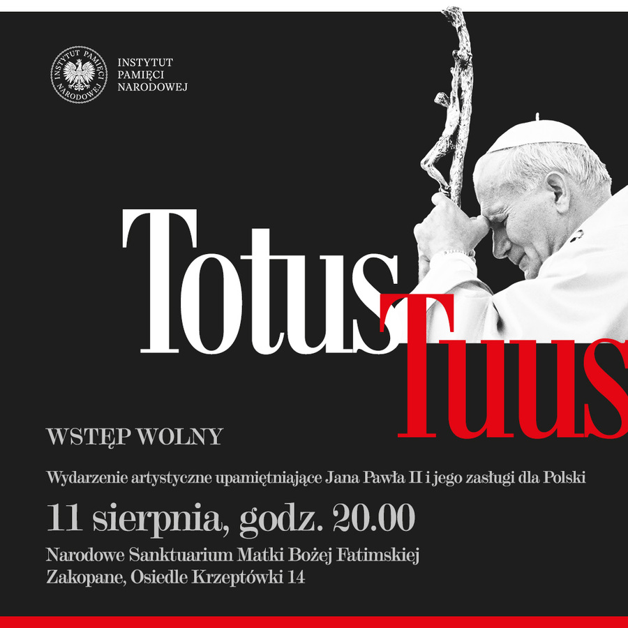 Instytut Pamięci Narodowej zaprasza na artystyczne wydarzenie upamiętniające Jana Pawła II i jego zasługi dla Polski, które odbędzie się 11 sierpnia 2024 r. (godz. 20) w Narodowym Sanktuarium Matki Bożej Fatimskiej na zakopiańskich Krzeptówkach.
