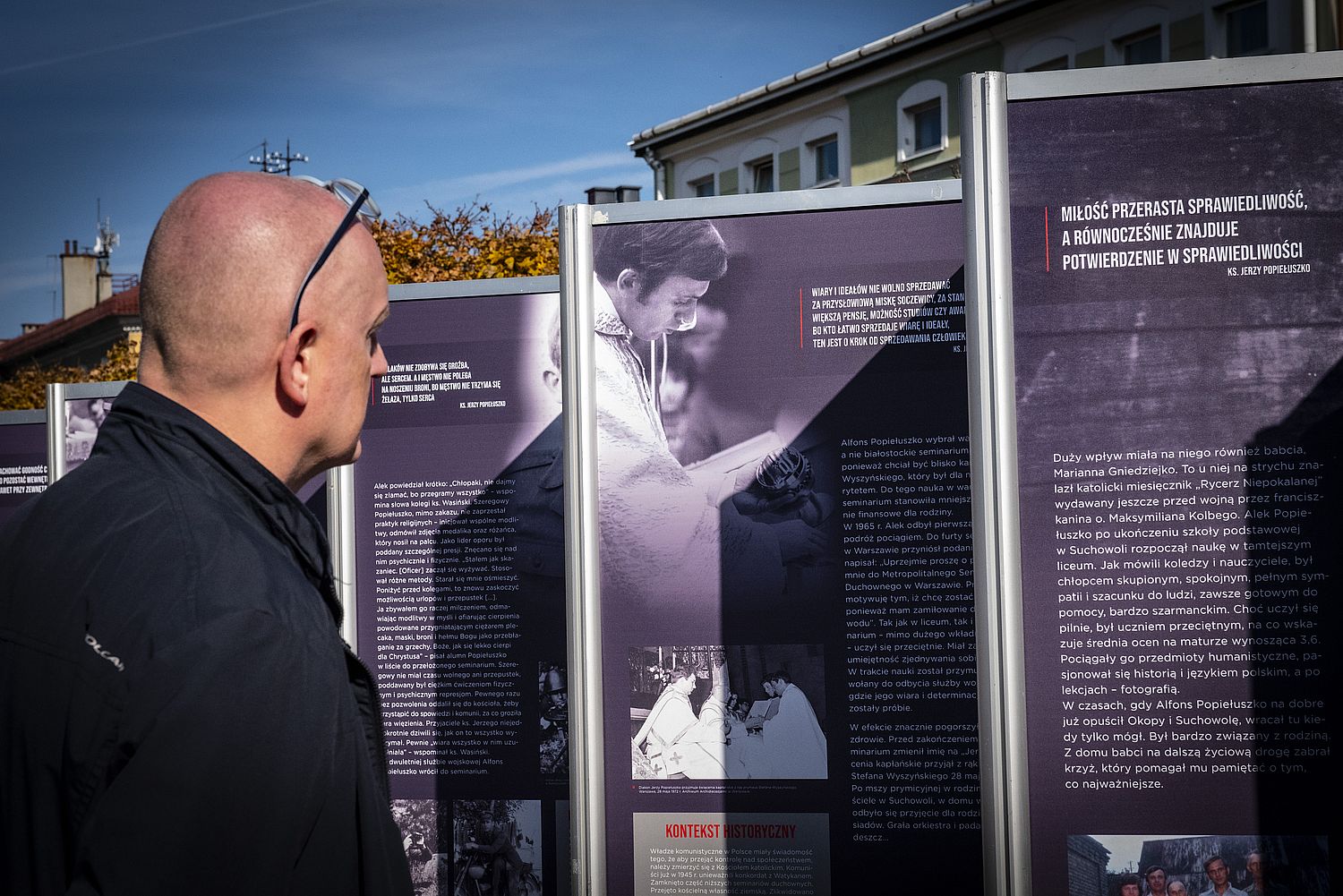 – Prezentujemy wystawę o człowieku, który stał się jedną z najważniejszych postaci historii Polski XX wieku, choć wcale o to nie zabiegał – powiedział w swoim wystąpieniu dr Musiał. – Mówimy o duchownym, który nade wszystko chciał troszczyć się o najsłabszych. Pamiętne msze święte za ojczyznę zaczął odprawiać nie wtedy, gdy trwał „karnawał Solidarności”, ale wtedy, kiedy ona była najsłabsza, gdy otrzymywała ciosy od reżimu Jaruzelskiego. Męstwo widoczne w tej postawie było jedną z cech, które towarzyszyły księdzu Jerzemu do śmierci. Męstwo i troska o najsłabszych. O tych, którym komunizm odbierał nie tylko prawa obywatelskie, ale nade wszystko godność. Właśnie o człowieczeństwo ksiądz Jerzy starał się walczyć. O nie się dopominał.