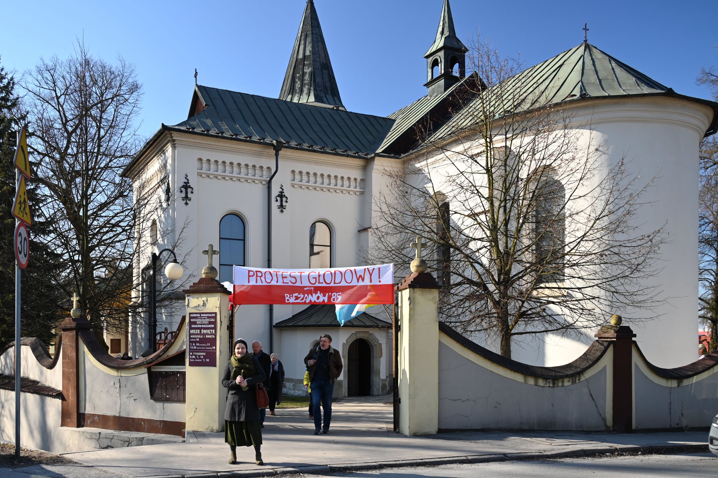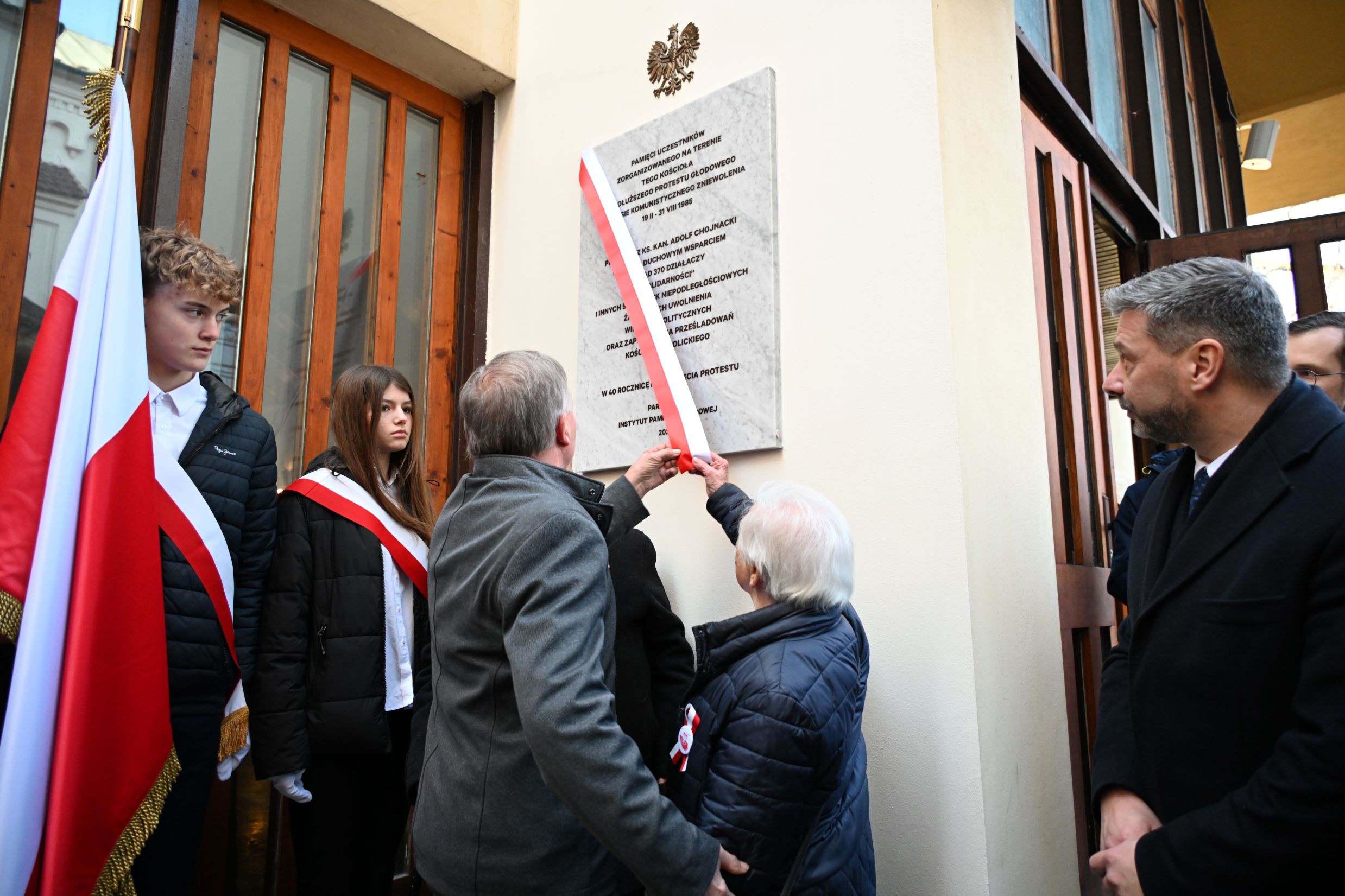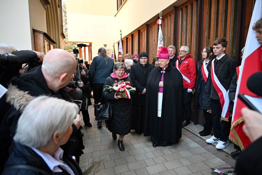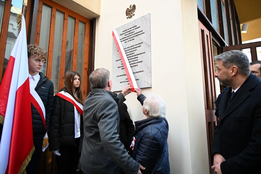 Następnie uczestnicy przeszli przed wejście do kościoła, gdzie abp Marek Jędraszewski poświęcił tablicę. Odsłonięcia upamiętnienia umieszczonego na elewacji świątyni dokonali reprezentujący uczestników głodówki Anna Pietras i Kazimierz Pająk oraz dr hab. Filip Musiał.