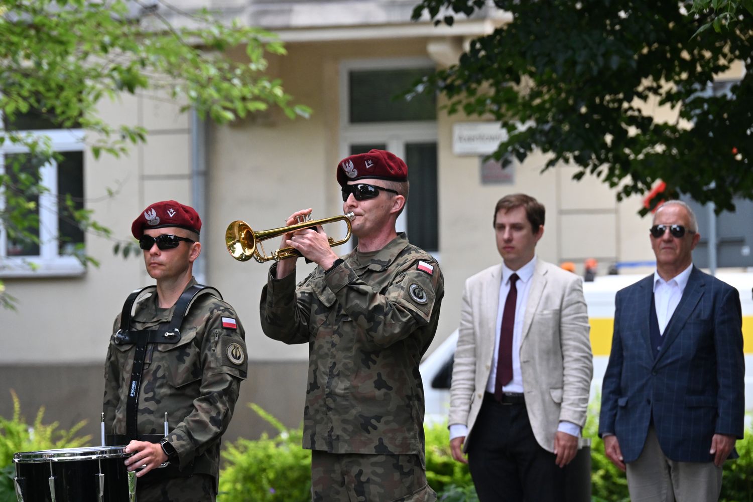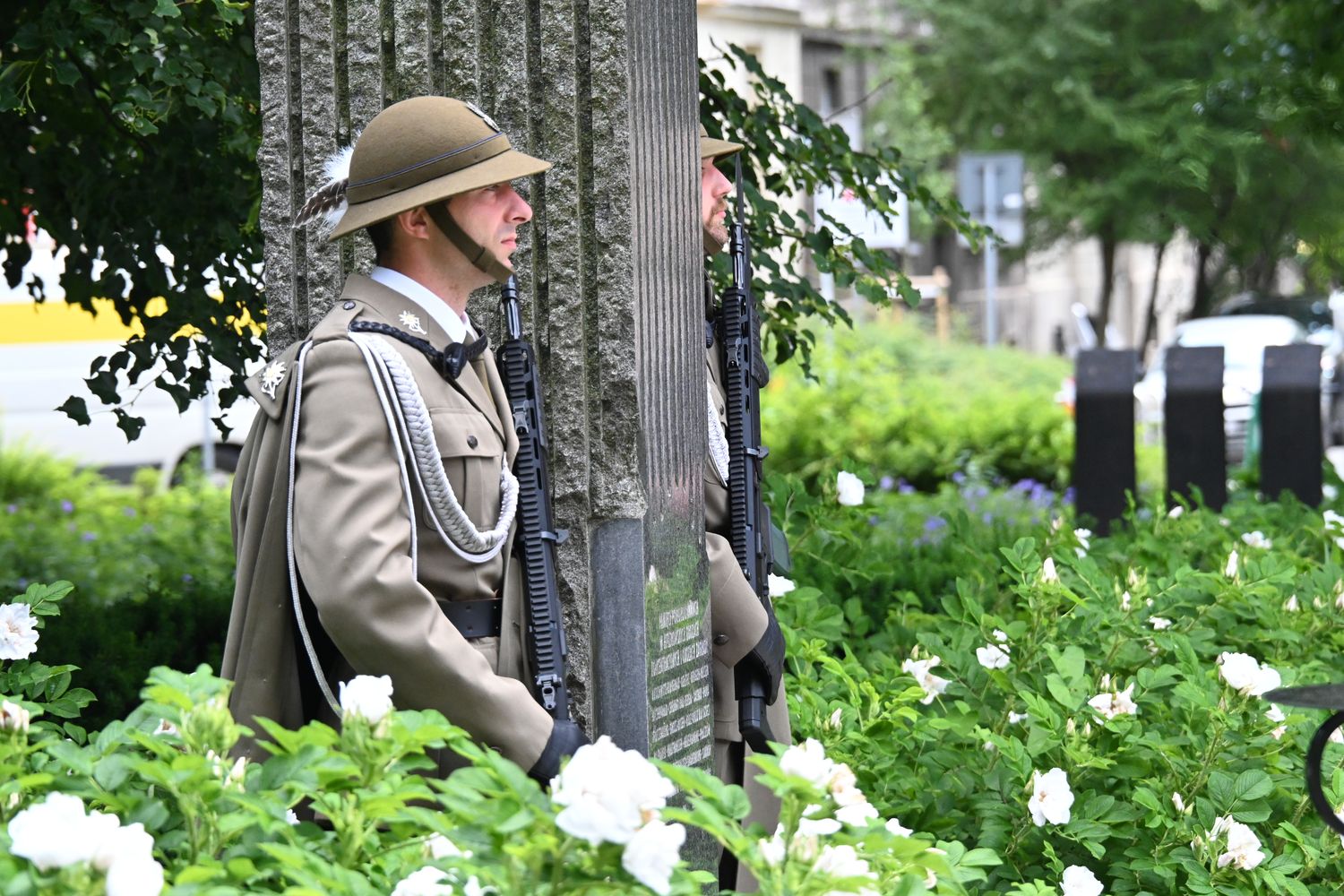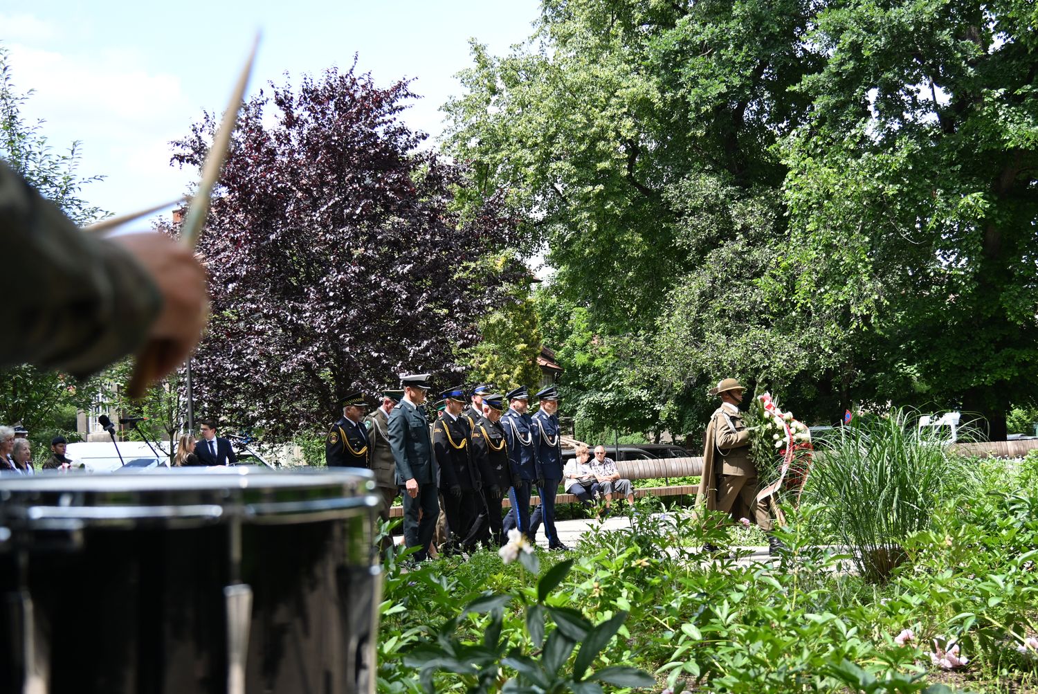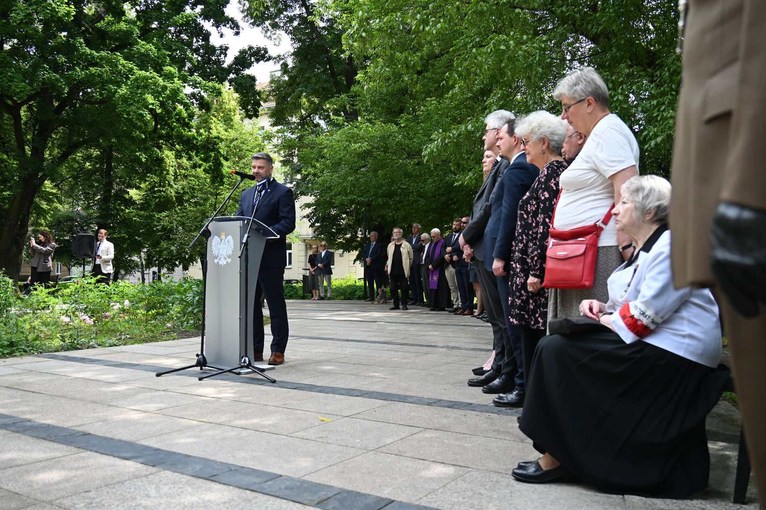 W uroczystości na pl. Axentowicza wzięła udział m.in. zastępca dyrektora biura wojewody Monika Kolasa, która odczytała list skierowany do zebranych przez wojewodę Krzysztofa Jana Klęczara, a także korpus dyplomatyczny, przedstawiciele władz samorządowych i służb mundurowych, organizacji kombatanckich i społecznych oraz poczet flagowy i kompania honorowa XXV Liceum Ogólnokształcącego im. Żeromskiego w Krakowie. Krótką modlitwę zmówił ks. Leszek Garstka, proboszcz parafii św. Szczepana, której kościół stoi po drugiej stronie pl. Axentowicza.