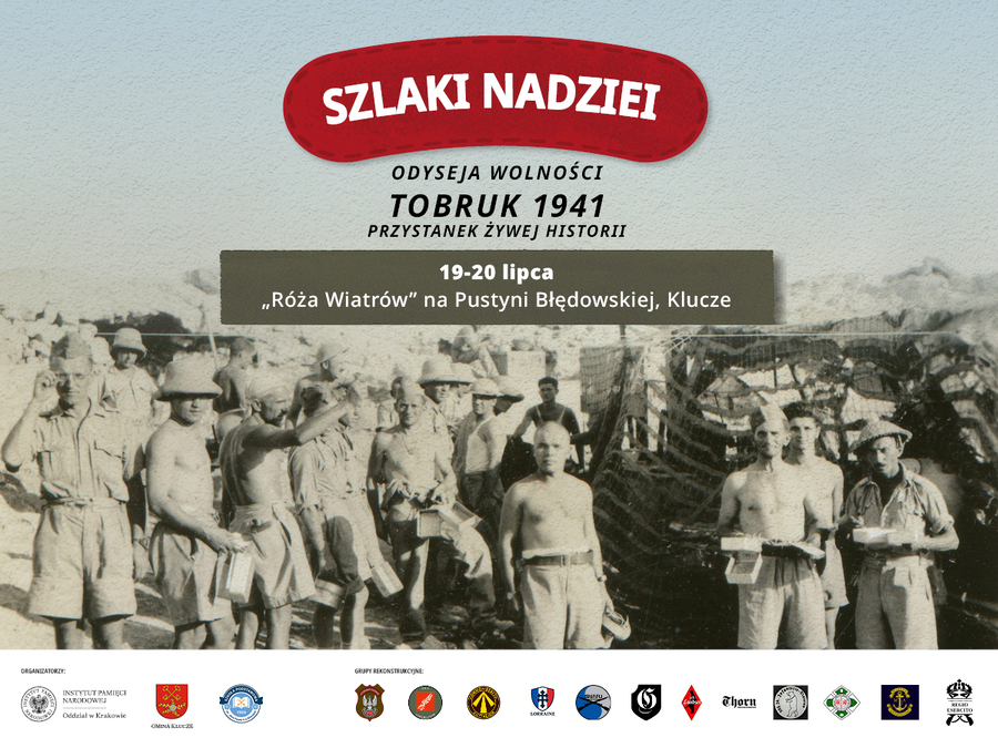W dniach 19-20 lipca 2025 r. w punkcie widokowym Róża Wiatrów na Pustyni Błędowskiej, razem z Gminą Klucze i grupami rekonstrukcji historycznej z całego kraju zorganizowaliśmy plenerowe wydarzenie „Szlaki Nadziei. Odyseja Wolności – Tobruk 1941. Przystanek Żywej Historii”.