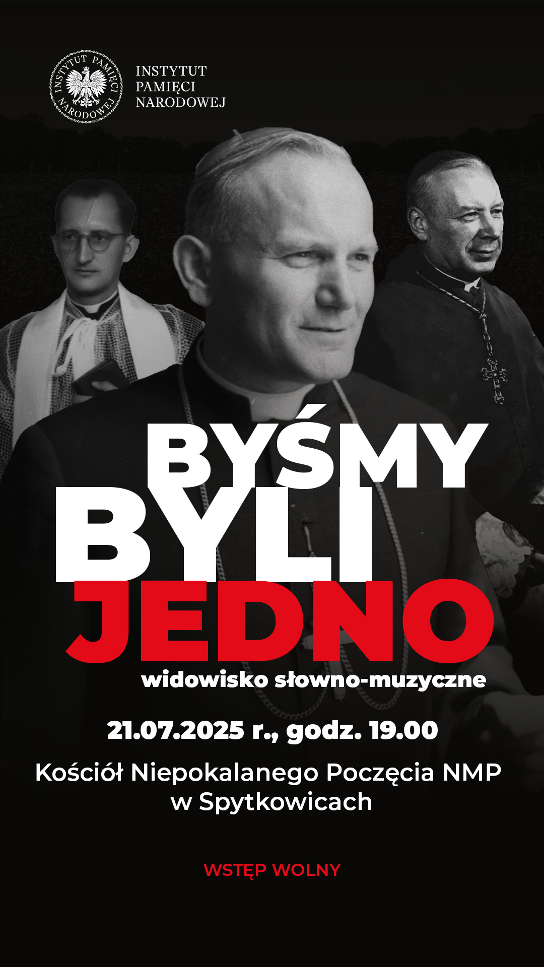 Widowiskiem „Byśmy byli jedno” pragniemy opowiedzieć historię Kościoła polskiego w czasach komunizmu. Narracja toczyć się będzie wokół działalności trzech czołowych postaci XX wieku – Stefana Wyszyńskiego, Karola Wojtyły oraz Franciszka Blachnickiego. Wydarzenie jest hołdem dla niezwykłych kapłanów poprzez ukazanie ścieżki ich życia wobec trudów prześladowań reżimu komunistycznego.