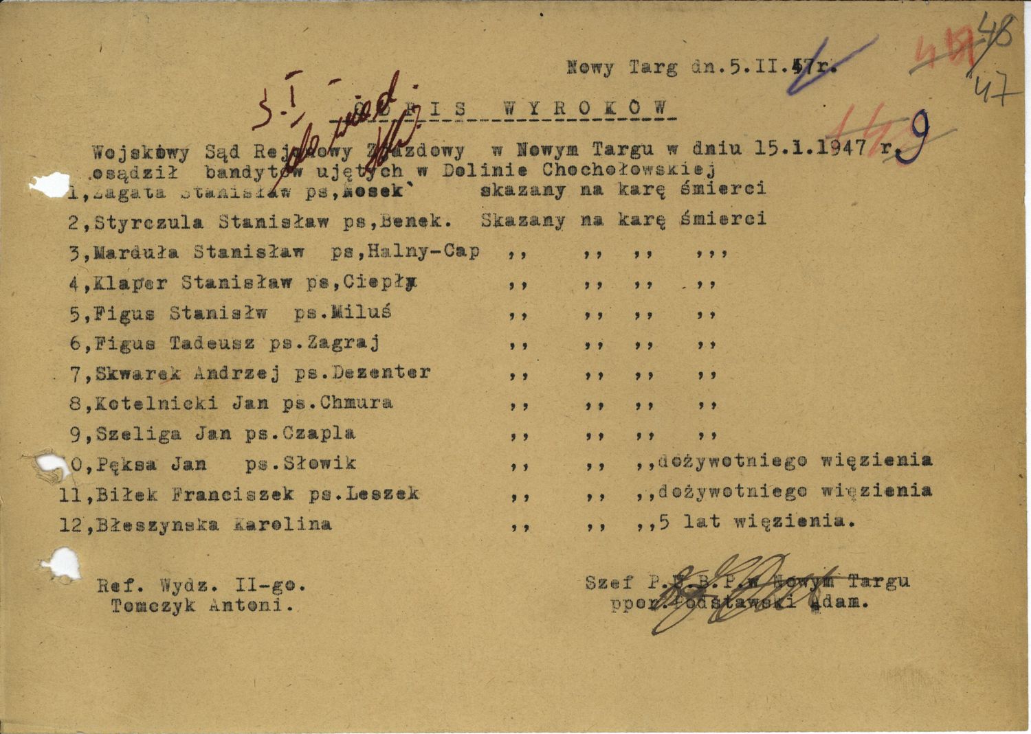 Spis wyroków wydanych przez WSR w Krakowie na partyzantów 2. kompanii zgrupowania „Błyskawica” i ich współpracowników. Fot. e zbiorów IPN -