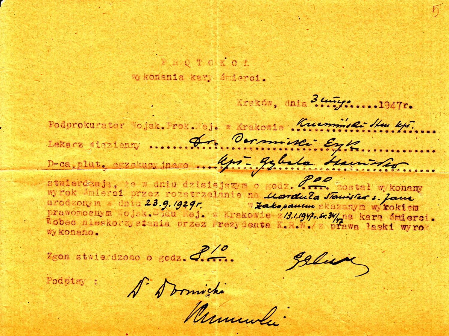 Protokół wykonania kary śmierci na Stanisławie Klaperze. Fot. ze zbiorów IPN