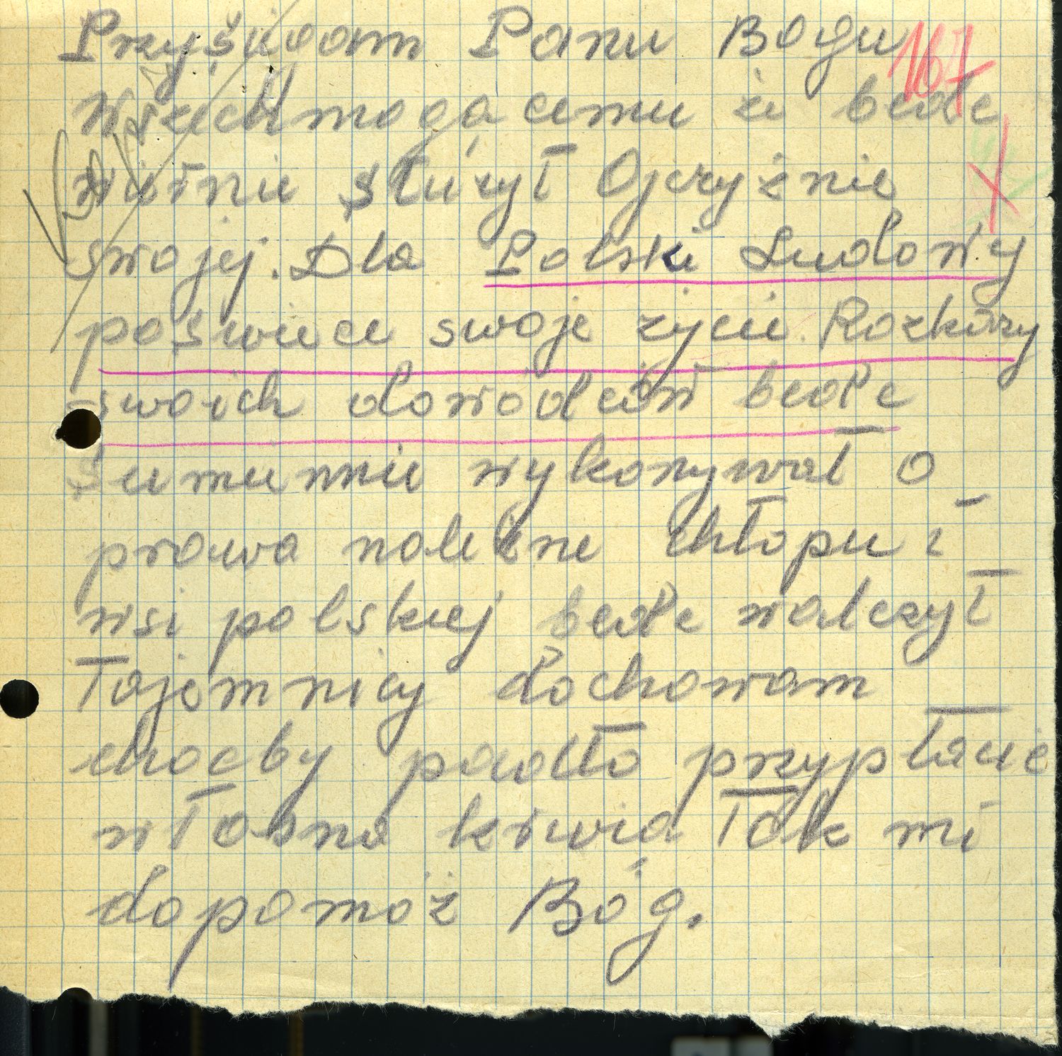 Tekst przysięgi składanej przez partyzantów zgrupowania „Ognia”, znaleziony wśród dokumentów 2. Kompanii. Fot. ze zbiorów IPN -