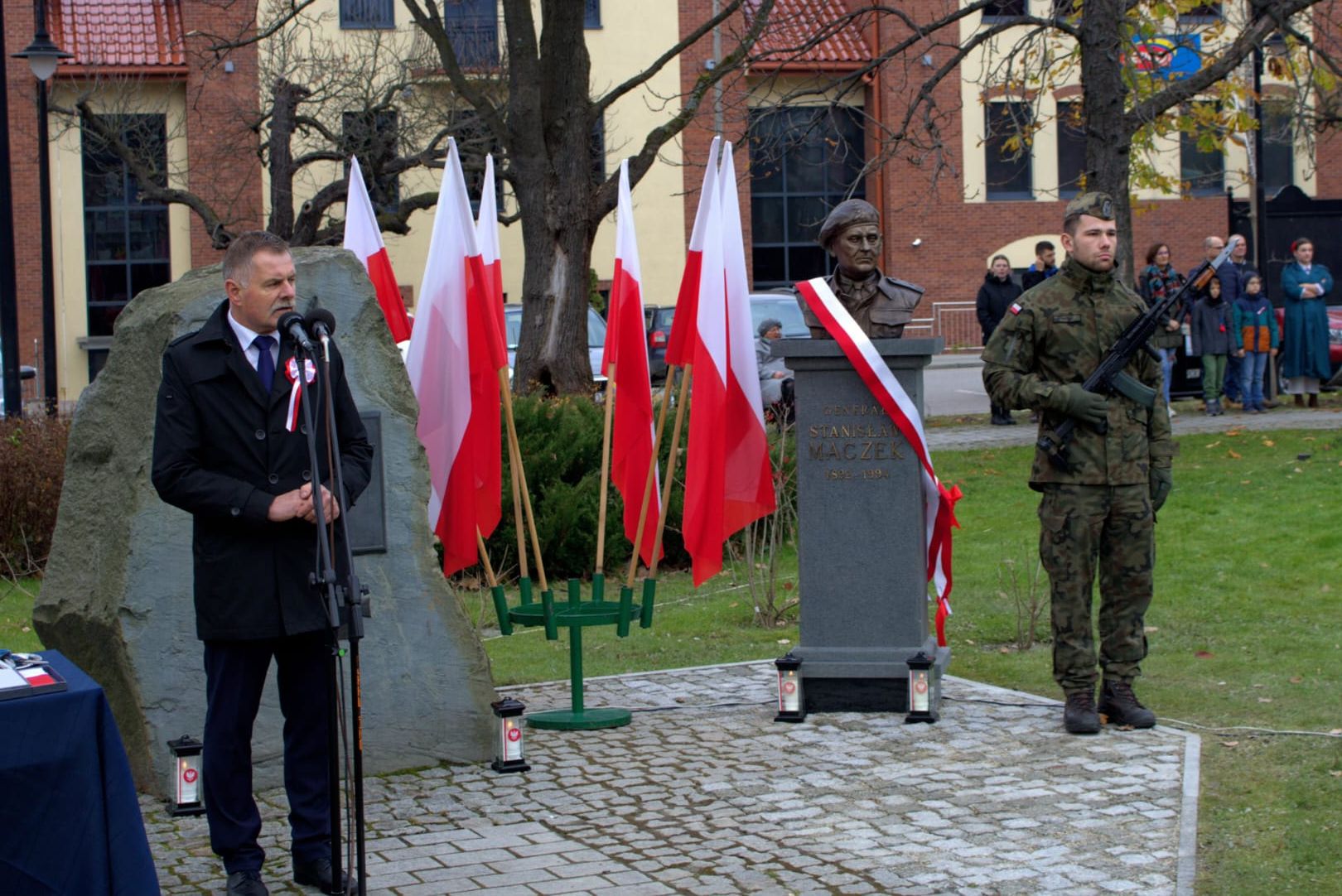 Po mszy świętej w kościele parafialnym uroczystości, w których wziął udział dyrektor krakowskiego oddziału IPN dr hab. Filip Musiał, przeniosły się na pobliski Rynek. Przemówienia wygłosili burmistrz Jordanowa, dr Musiał oraz starosta powiatu suskiego. Odczytano również listy skierowane do uczestników uroczystości przez prezydenta Karola Nawrockiego i wnuczkę gen. Maczka. Po odsłonięciu popiersia odczytany został Apel Pamięci, po którym nastąpiła ceremonia złożenia kwiatów.