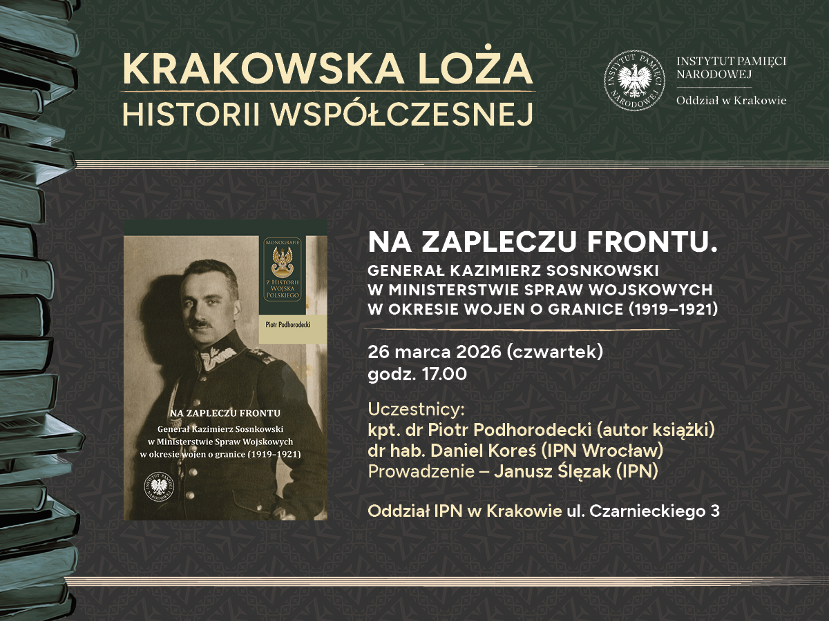 Tematów do rozmowy dostarczy nam wydana w ub. roku książka pt. „Na zapleczu frontu. Generał Kazimierz Sosnkowski w Ministerstwie Spraw Wojskowych w okresie wojen o granice (1919–1921)”. Będziemy gościć w Krakowie jej autora kpt. dr. Piotra Podhorodeckiego oraz dr. hab. Daniela Koresia (Oddział IPN we Wrocławiu), redaktora serii „Z Historii Wojska Polskiego”. Prowadzenie Janusz Ślęzak (Oddział IPN w Krakowie).