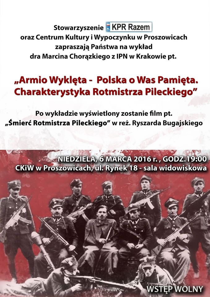Stowarzyszenie KPR Razem oraz Centrum Kultury i Wypoczynku w Proszowicach zapraszają na wykład dr. Marcina Chorązkiego z OBEP IPN w Krakowie pt. „Armio Wyklęta – Polska o Was Pamięta. Charakterystyka rotmistrza Pileckiego”. Po wykładzie zostanie wyświetlony film „Śmierć rotmistrza Pileckiego" w reżyserii Ryszarda Bugajskiego.