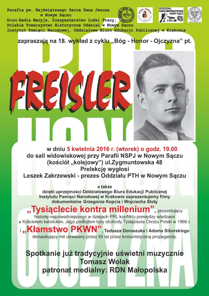 Oddział PTH w Nowym Sączu oraz Oddziałowe Biuro Edukacji Publicznej IPN w Krakowie zapraszają na 18. wykład z cyklu „Bóg – Honor – Ojczyzna”. Leszek Zakrzewski wygłosi prelekcję na temat sądeckiego kuriera Jana Freislera, zaprezentowane zostaną dwa filmy dokumentalne – „Tysiąclecie kontra Millenium" oraz „Kłamstwo PKWN”.
