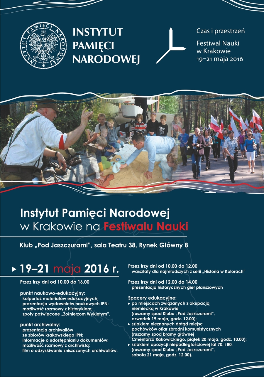 Oddział Instytutu Pamięci Narodowej w Krakowie zaprasza na Festiwal Nauki w dniach 19–21 maja br. w godzinach od 10.00 do 16.00 do Klubu „Pod Jaszczurami”. Podczas Festiwalu będą odbywać się spotkania z historykami, prezentacje książek, wystaw i materiałów edukacyjnych oraz projekcje filmów. Zapraszamy także do wzięcia udziału w zajęciach z serii „Historia w kolorach” („Polak Mały”) oraz w historycznych grach planszowych.